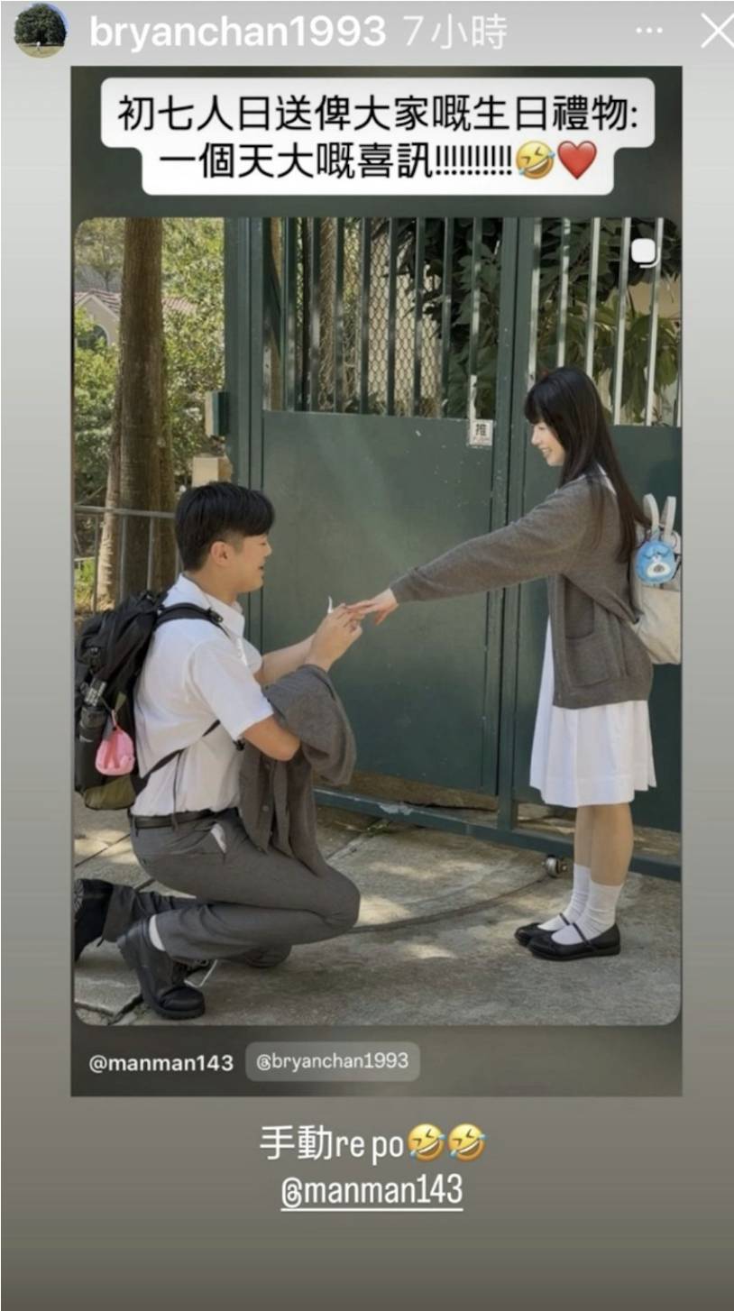 江華及麥潔文的32歲大仔陳耀淙(Bryan)近日宣布向女友求婚成功,他在Instagram限時動態分享求婚成功的喜訊,相片中他與女友Manman穿上校服,在校門前重現學生時代的青春模樣。從相片中看到,陳耀淙手持戒指單膝下跪,向女友深情求婚,場面相當浪漫感人。這位投身醫護界的32歲「準人夫」選擇用這種別出心裁的方式向愛人表白,充分展現了他的浪漫細胞和創意思維。