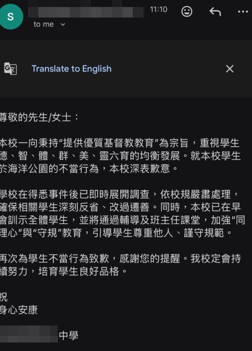 涉事學校發聲明致歉 承諾嚴肅處理學生