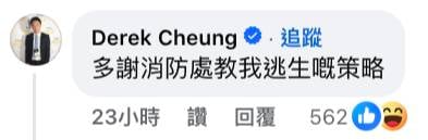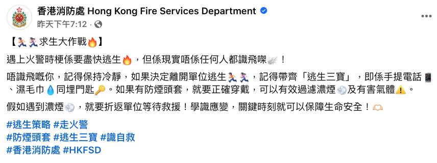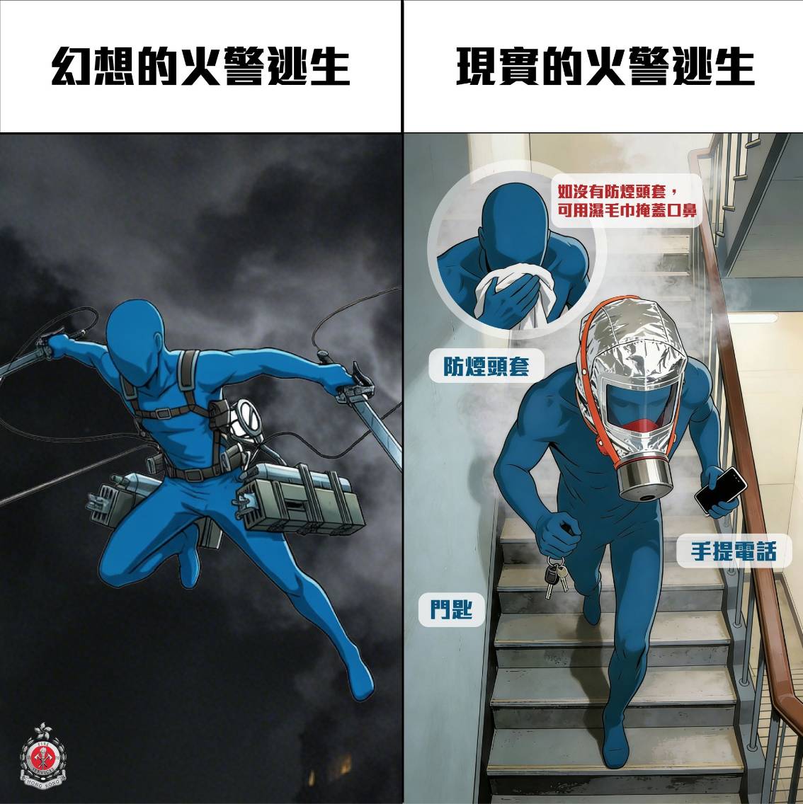 就在全城熱議鍾培生飛天求婚之際,消防處其後社交平台發文罕有「抽水」,以日劇《求婚大作戰》諧音「求生大作戰」,提醒市民遇上火警時的正確逃生方法。帖文幽默地指出「現實唔係任何人都識飛㗎」,提醒市民遇到火警時要保持冷靜,並記得帶齊「逃生三寶」包括手提電話、濕毛巾及門匙,若有防煙頭套也要正確穿戴,以有效過濾濃煙及有害氣體。消防處更特別提醒,若遇到濃煙便要折返單位等待救援,絕不能貿然行動。