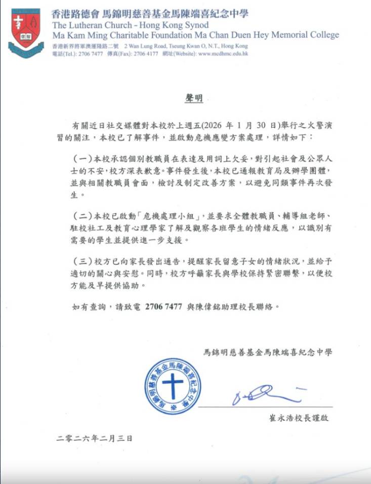 位於將軍澳的馬錦明慈善基金馬陳端喜紀念中學在官網發聲明,稱社交媒體關注對校方於1月30日舉行的火警演習,校方已了解事件並啟動危機應變方案處理。校方承認個別教職員在表達及用詞上欠妥,對引起社會及公眾人士的不安深表歉意。事件發生後,校方已通報教育局及辦學團體,並與相關教職員會面,檢討及制定改善方案,以避免同類事件再次發生。校方已啟動「危機處理小組」,要求全體教職員、輔導組老師、駐校社工及教育心理學家了解及觀察各班學生的情緒反應。