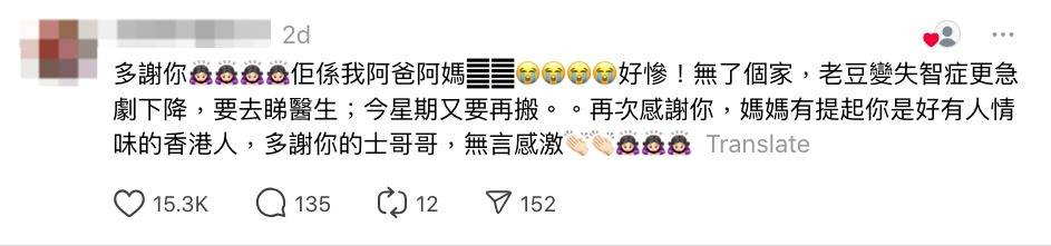 司機透露,「之後即刻上客去大圍,果程車我雙眼不由自主不停留淚」,這段真摯的分享反映出災民面對的實際困境,特別是患有失智症的長者在失去家園後所承受的額外痛苦。司機全文如下: