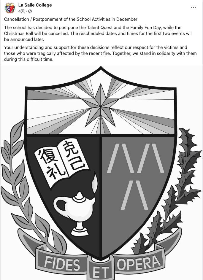喇沙書院向學生及家長發出通知,因應大埔宏福苑五級火災的嚴重影響,決定作出多項調整。學校宣布Talent Quest和Family Fun Day將延期舉行,而備受學生期待的Christmas Ball則正式取消。此外,原定12月15日的假期改為正常上課日,Christmas Mass亦改期舉行,課堂將於彌撒後恢復。學校強調這項決定是為了體現對火災受害者的尊重,並表示將繼續關注學生需求,提供相關支援。