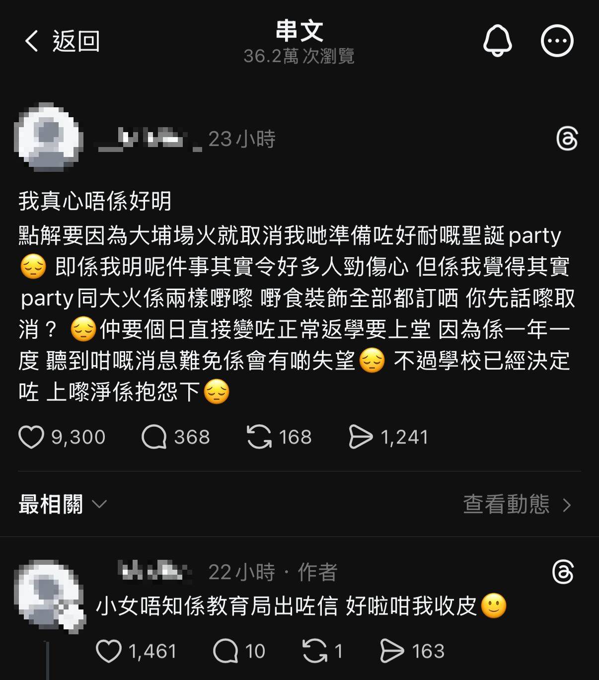 除了喇沙書院外,其他學校的學生亦對取消聖誕派對表示失望。有學生在社交平台Threads發文表示不理解學校的決定,「我真心唔係好明,點解要因為大埔場火就取消我哋準備咗好耐嘅聖誕party」。該學生雖然理解火災事件令「好多人勁傷心」,但認為「party同大火係兩樣嘢嚟」,在「嘢食裝飾全部都訂哂」之後,學校才突然決定取消。最令學生難以接受的是,聖誕派對不僅被取消,還「直接變咗正常返學要上堂」,「仲要改為正式上堂,真係離晒大譜!」,一年一度的期盼落空令人失望。