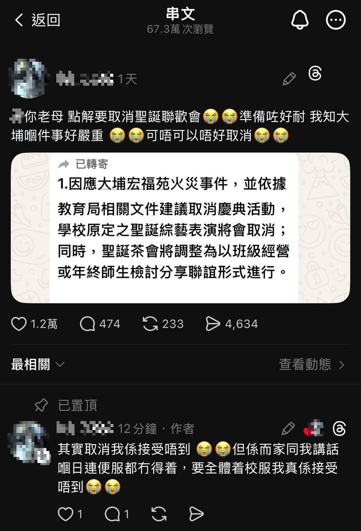 學生的不滿言論在網上引起熱烈討論,網民意見出現明顯分歧。支持學校決定的網民指出,聖誕節距離火災發生不足一個月,認為在這個時間點強行要求慶祝並不適合,「你諗吓聖誕嗰日正正係一個月」,直言「就算照搞你又有心情玩咩?」另一方面,有網民認為校方「真係好唔識變通」,全面取消會令「學生成個月都活係沉重氣氛入面」,強調「成年人都頂唔順呢啲壓抑嘅氣氛啦何況小朋友」、「應該教學生 life must go on 才對吧」。部分網民建議校方可以「轉少少個主題,唔係慶祝需要,係安慰同祝福咁開Party」,或者「利用活動籌款幫人同教育」,認為將節日氣氛轉化為社會關懷會更恰當。