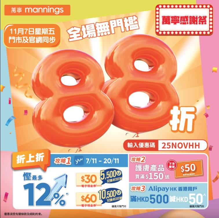 除了全場88折之外,精明的消費者還能疊加多重優惠,更可慳錢。yuu會員可在11月7日至20日期間,以優惠積分兌換萬寧電子現金券,例如用5,500 yuu積分換取$30現金券,比平常兌換節省近10%,變相為購物提供額外折扣。與此同時,AlipayHK用戶在11月30日前,只需於店內掃描指定二維碼,即可領取「消費滿$500減$50」的禮券。