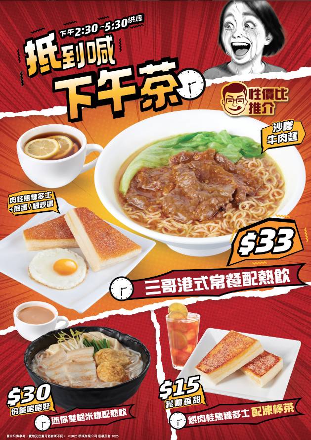 譚仔三哥米線同樣推出下午茶買一送一優惠,套餐包括沙嗲牛麵、肉桂焦糖多士配煎蛋或炒蛋,以及熱飲一杯。套餐定價33元,買一送一後人均16.5元即可享用。優惠時間為下午2時30分至5時30分,比譚仔雲南米線的優惠時間稍長半小時。同樣每日每店限量30套,必須使用八達通付款。