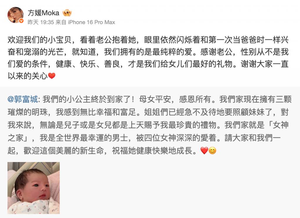 在太太方媛平安誕下第三胎的消息曝光後,郭富城急不及待地在個人社交平台上發文,向外界宣布母女平安的好消息。他同時揭曉,第三胎同樣是一位「小公主」,這也直接打破了外界一直以來關於他將會迎來兒子的猜測。郭富城在帖文中難掩再度為人父的興奮之情,寫下家中如今擁有三顆璀璨的明珠,讓他感到無比的幸福與富足。