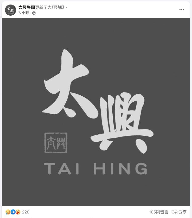 陳永安 太興 太興集團官方網站、所有社交平台均轉黑白,表達哀悼之情,很多網民都留言致哀。(圖片來源:Facebook@太興集團)