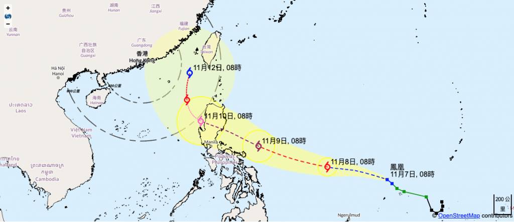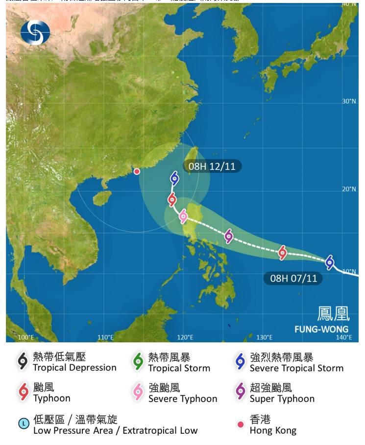 天文台表示,熱帶氣旋鳳凰今日正式增強為熱帶風暴級別,預料在未來數日會持續加強。根據最新預測,鳳凰將在周日(11月9日)達到超強颱風級別,並會以此強度橫掃菲律賓呂宋島。隨後鳳凰會進入南海東北部,有較大機會轉向偏北方向移動,大致移向台灣一帶。天文台指出,受下周初至中期的乾燥東北季候風影響,鳳凰會逐漸減弱,但轉向位置及減弱速度仍存在變數。