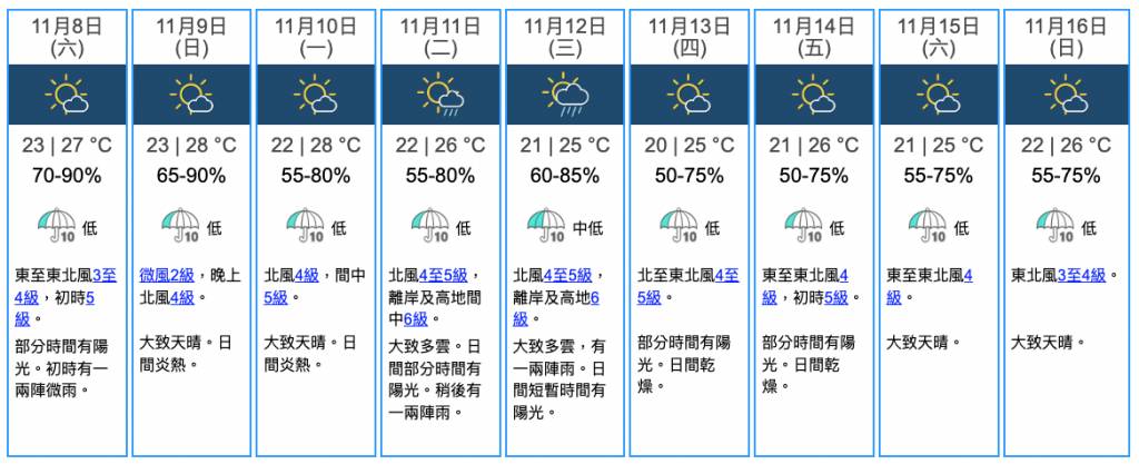 天文台預料,高空反氣旋會在未來一兩日影響本港,該區天色保持良好。不過隨著鳳凰及東北季候風的影響,本港天氣將會出現明顯轉變。據九天天氣預報顯示,下周四(11月13日)市區最低氣溫將會跌至攝氏20度,較現時氣溫明顯下降。天文台提醒市民要留意天氣變化,適時添衣保暖,特別是長者及小童等較易受寒的人士。