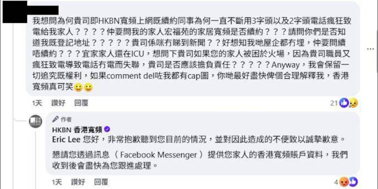 11月29日凌晨,有宏福苑居民在香港寬頻Facebook專頁留言投訴,指家人受傷後在深切治療部(ICU)留醫,但仍不斷接獲該公司職員致電詢問是否為家居寬頻續約。該名災民憤怒地質問:「我想問為何貴司即HKBN寬頻上網嘅續約同事,為何一直不斷用3字頭以及2字頭電話瘋狂致電給我家人?仲要問我的家人宏福苑的家居寬頻是否續約?請問你們是否知道我嘅登記地址?貴司係咪冇睇到新聞?好想知我哋屋企都冇埋,仲要問續唔續約?而家家人還在ICU。」災民更表明會「保留一切追究權利」,要求香港寬頻作出合理解釋。
