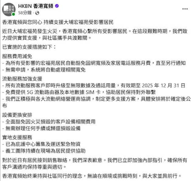 事件持續發酵後,香港寬頻終於在11月30日晚上8時53分在Facebook發出正式聲明,就有宏福苑居民接到「銷售聯絡」深表歉意。公司表示已立即加強內部指引,「確保所有客戶溝通均保持尊重與適切」。香港寬頻強調「心繫所有受影響居民」,承諾在這段艱難時期提供「實質支援」,包括為所有受影響的宏福苑居民「自動豁免固網寬頻及家居電話服務月費,直至另行通知」,期望與社區攜手「共渡難關」。