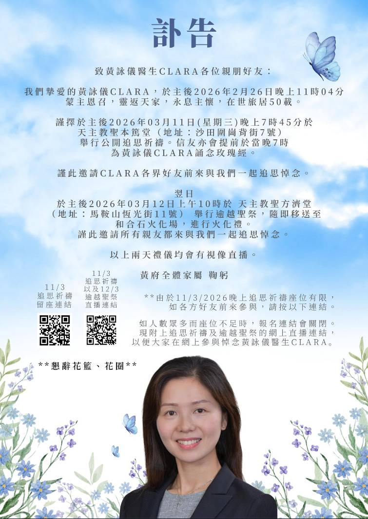 黃詠儀醫生家屬發出訃告公布追思會詳情,在下周三(3月11日)晚上將會在沙田天主教聖本篤堂舉行公開追思禱告,翌日上午在馬鞍山天主教聖方濟堂舉行逾越聖祭,之後移送和合石進行火化禮。相信屆時將有大批醫學界同僚、學生和病人前往送別這位德高望重的醫者。