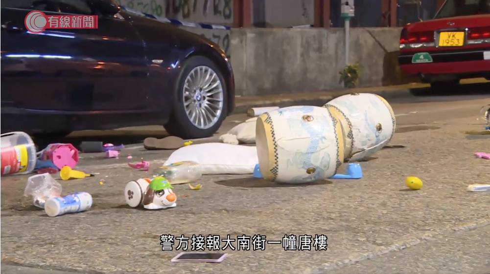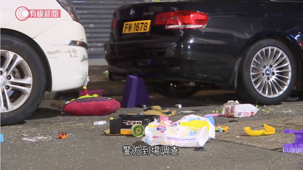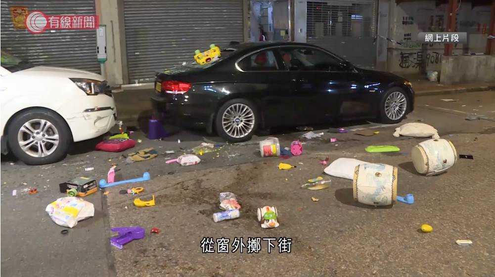 今日(11日)凌晨零時許,深水埗大南街343至345號發生駭人聽聞的高空墮物案。現場消息指,涉事單位為5樓一個「一劏三」的劏房,當時一名4歲烏干達籍男童獨自留在家中,不知何故開始瘋狂將屋內玩具和雜物掟落街。根據網上流傳的圖片和影片顯示,男童從單位窗邊扔下疑似黃色玩具車,直接擊穿樓下一輛私家車的車尾玻璃窗,玻璃碎片四散。從網上影片中見到,事發後整條馬路散落大量物品,包括尿片、枕頭、電熱水煲、音樂鼓,還有食物提子、即食麵等,現場一片狼藉,猶如颱風過境般慘烈。