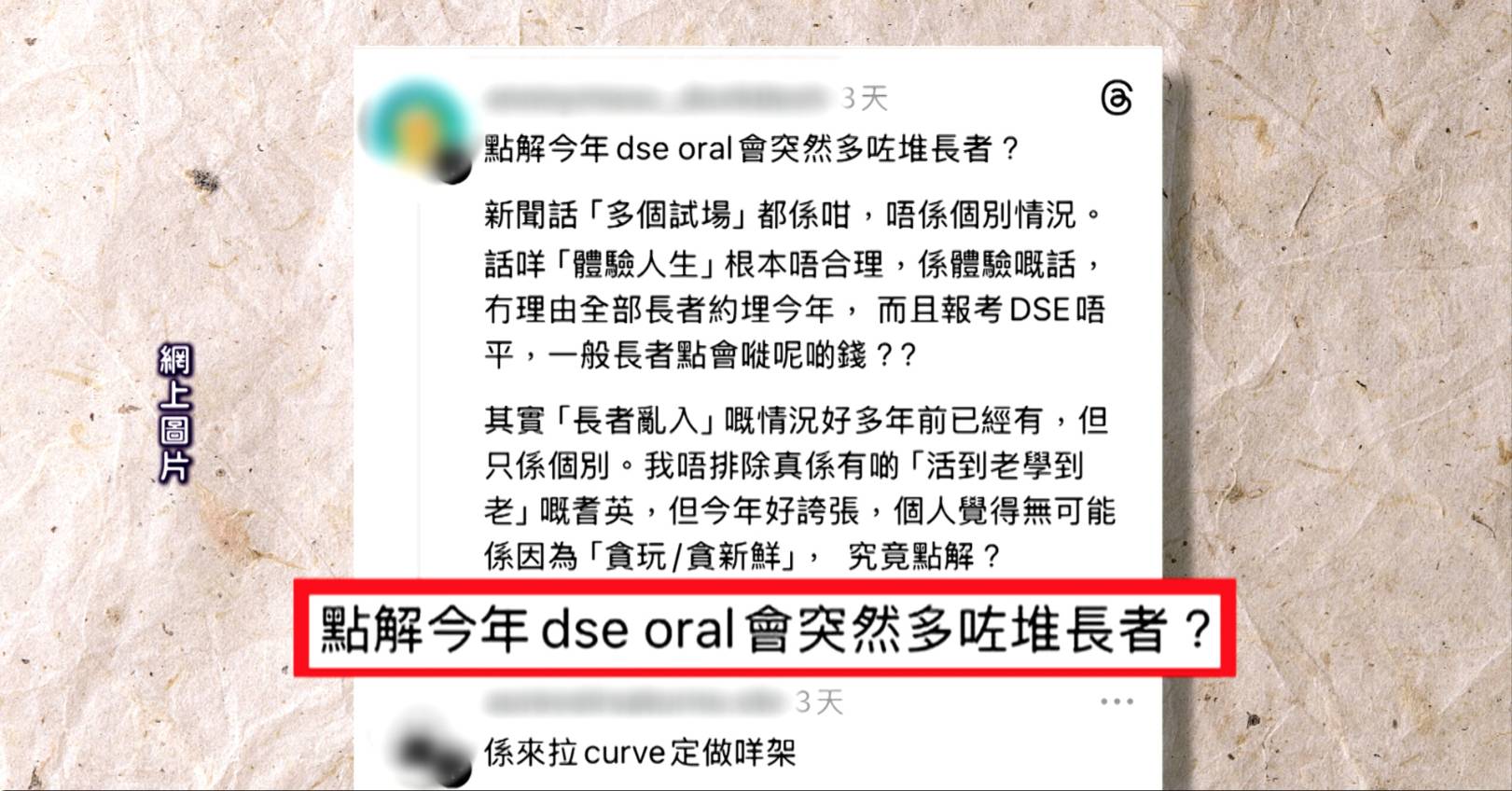 有應屆DSE考生在Threads發帖分享奇特考試經歷,表示在「英文Speaking」考試中遇到一名年約50至60歲的女士,形容對方「成頭白髮、成面皺紋」,與一般中六考生年齡差距甚大。該考生指,起初以為該名長者考生「好把炮」,豈料進入討論環節後發現情況完全相反。