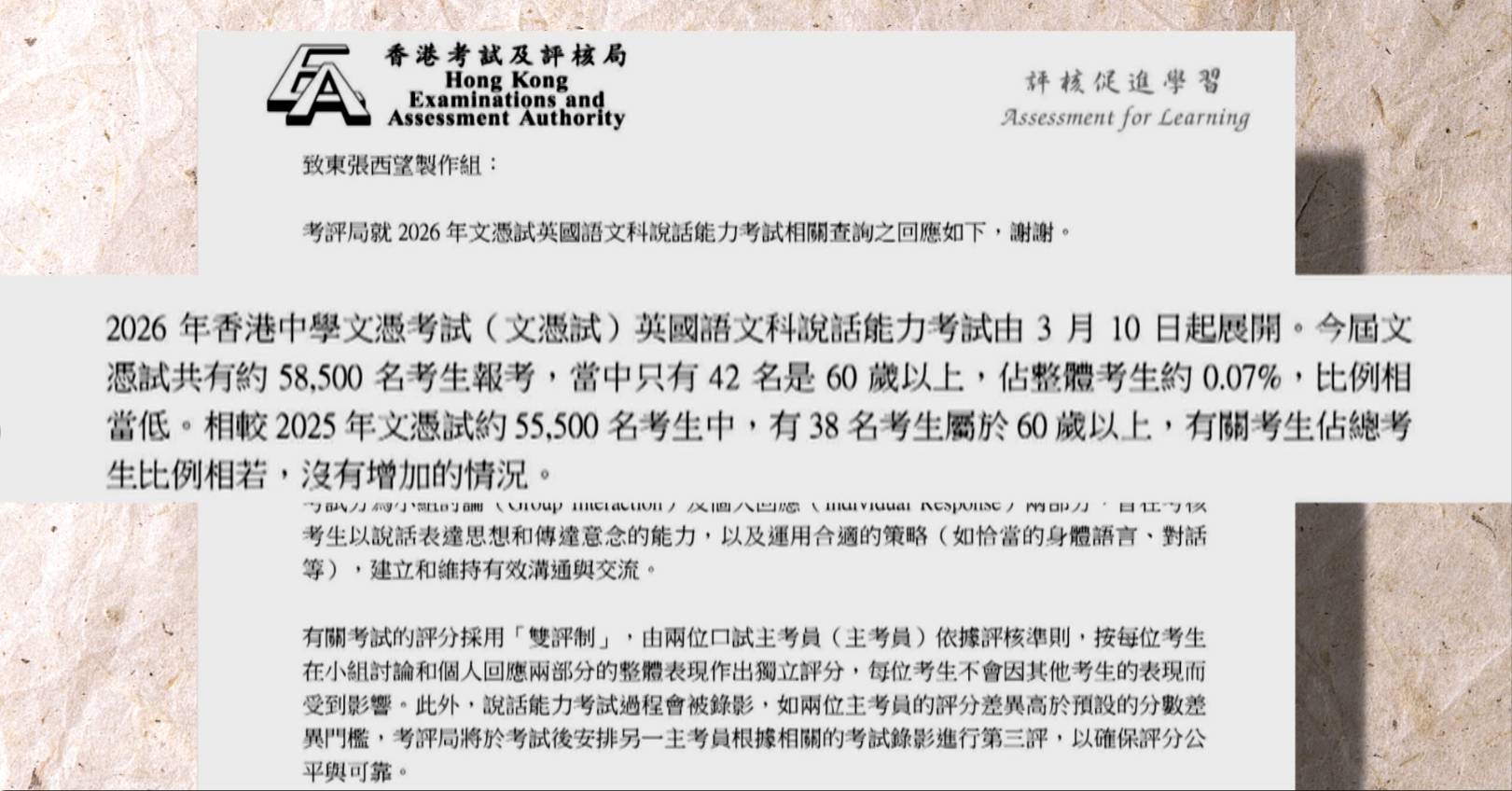 《東張西望》隨即向考評局查詢,考評局回覆指,今年共有58,500名考生應考,其中60歲以上考生有42名,與往年大致相若。考評局強調,今年文憑試並無發現有人有意破壞試場秩序。