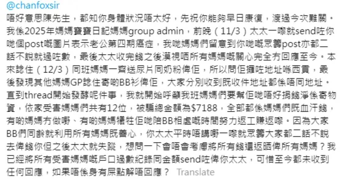 事件進一步發酵,一班媽媽現身控訴Natalie,媽媽群組管理員發文揭露,Natalie曾在群組內分享丈夫患病情況,12位媽媽「二話不說就過咗數」,合共捐出7,188元。管理員強調雖然數額不算龐大,但全部都是媽媽們的血汗錢,
