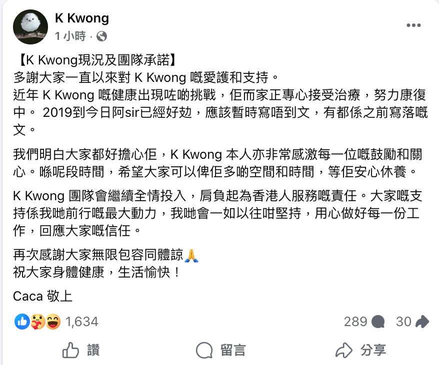 K Kwong團隊在11月17日晚上10時多,在社交平台發表聲明,感謝大眾一直以來的愛護和支持。聲明指出「近年K Kwong嘅健康出現咗啲挑戰,佢而家正專心接受治療,努力康復中」,並表示自2019年至今K Kwong已經很疲累,應該暫時寫不到文章。團隊成員Caca代表發聲,希望大眾給予K Kwong更多空間和時間安心休養,強調團隊會繼續全情投入為香港人服務。團隊完整如下: