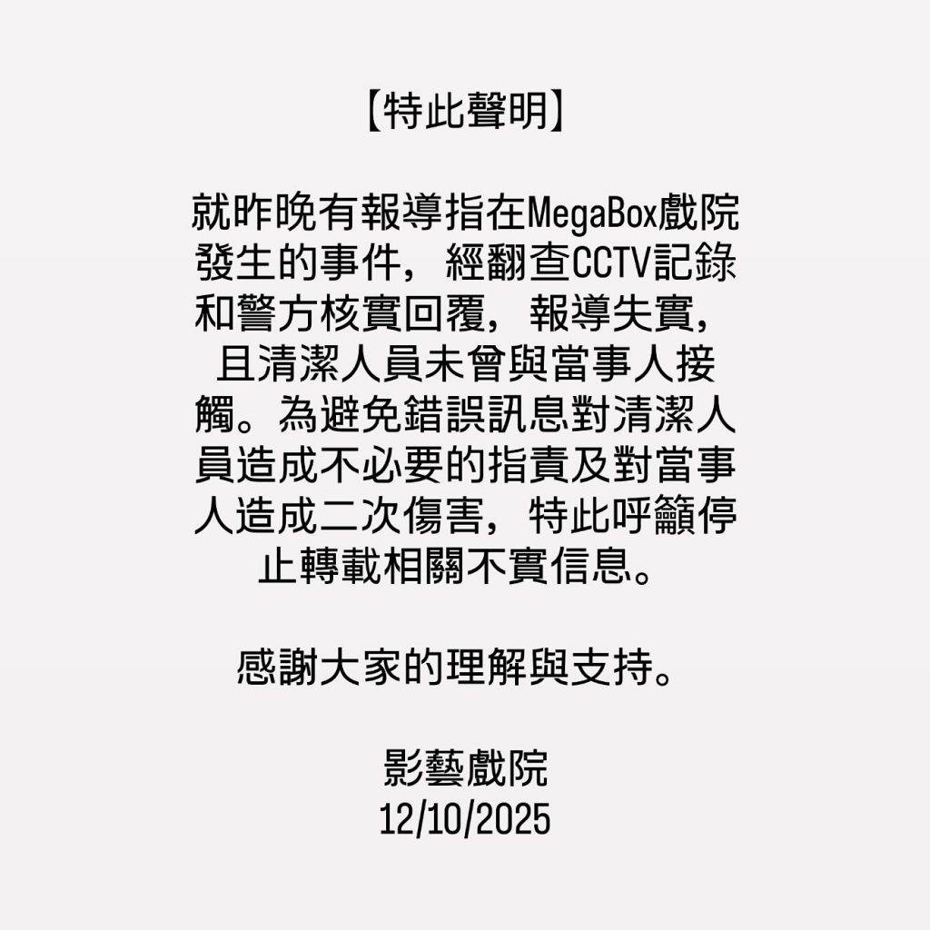 就昨晚有報導指在MegaBox戲院發生的事件,經翻查CCTV記錄和警方核實回覆,報導失實,且清潔人員未曾與當事人接觸。為避免錯誤訊息對清潔人員造成不必要的指責及對當事人造成二次傷害,特此呼籲停止轉載相關不實信息。