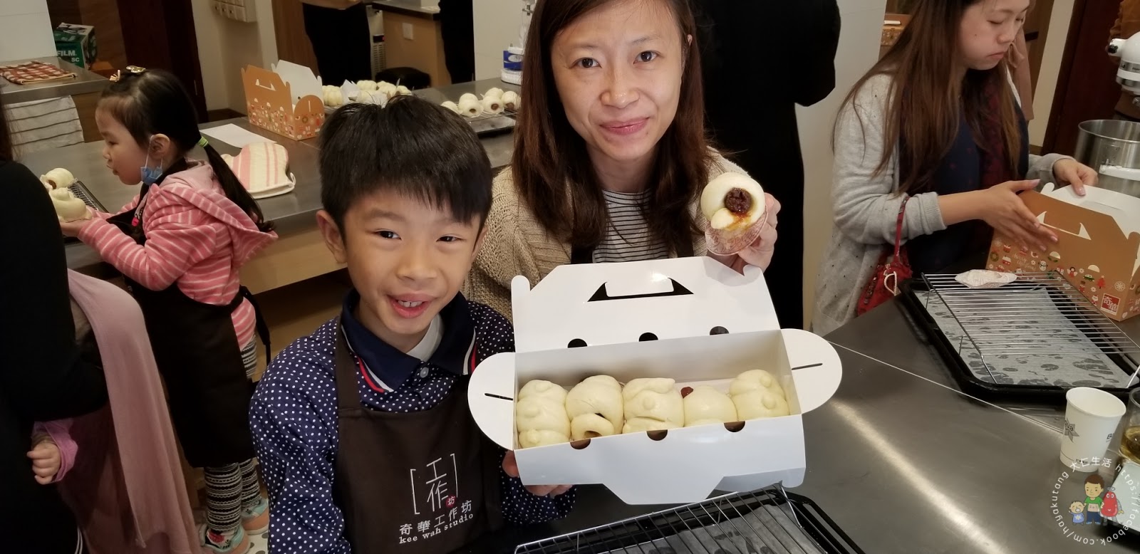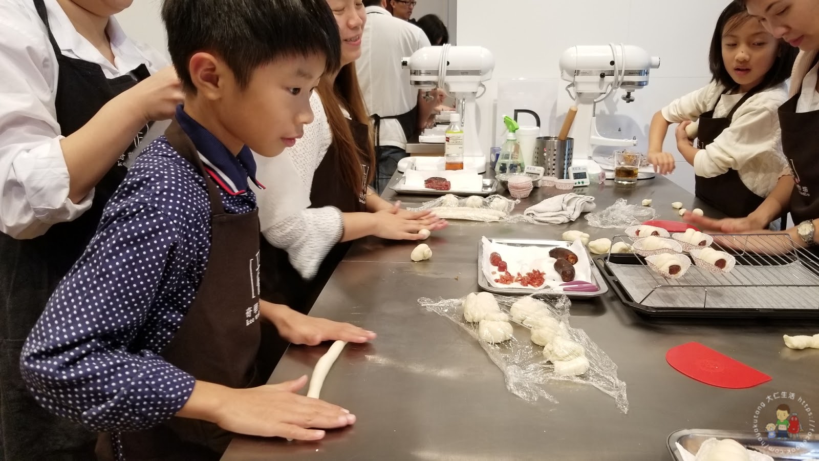 原來將麵糰包裹著臘腸是不用完全覆蓋的, 我問老師原因, 她答:「因為一陣蒸完D皮會發大呀!」