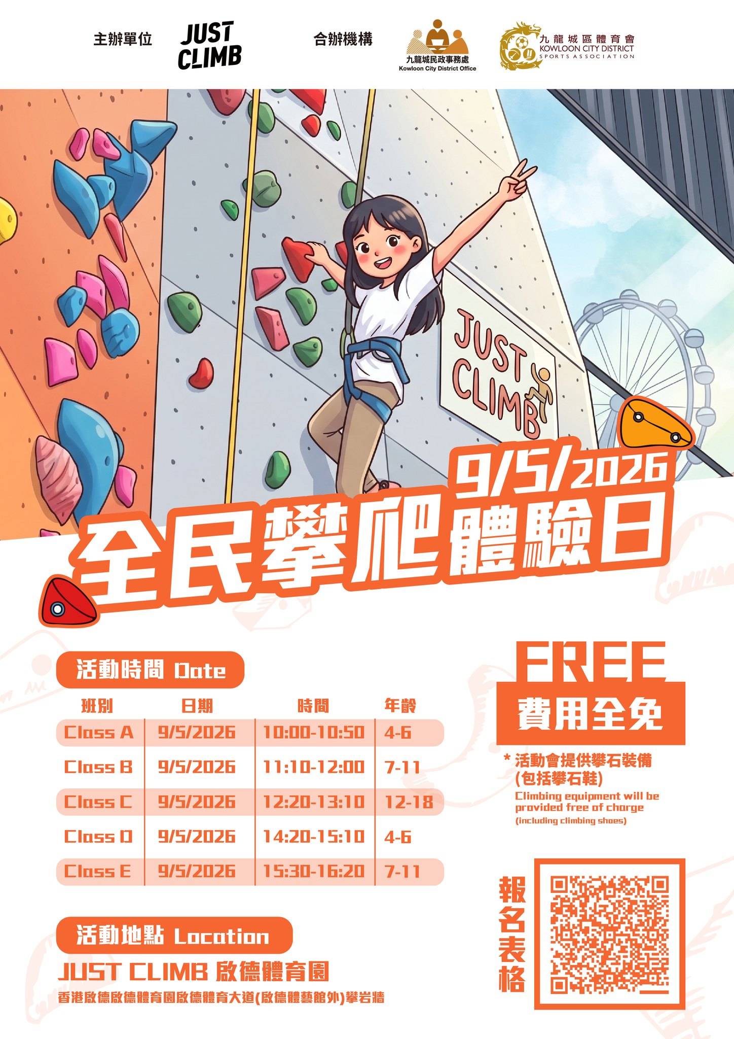「全民攀爬體驗日」將於2026年5月9日舉行,誠邀4至18歲小朋友及青少年參與,並由專業教練在場指導,讓參加者親身體驗攀石樂趣,安全地挑戰體能與勇氣。
