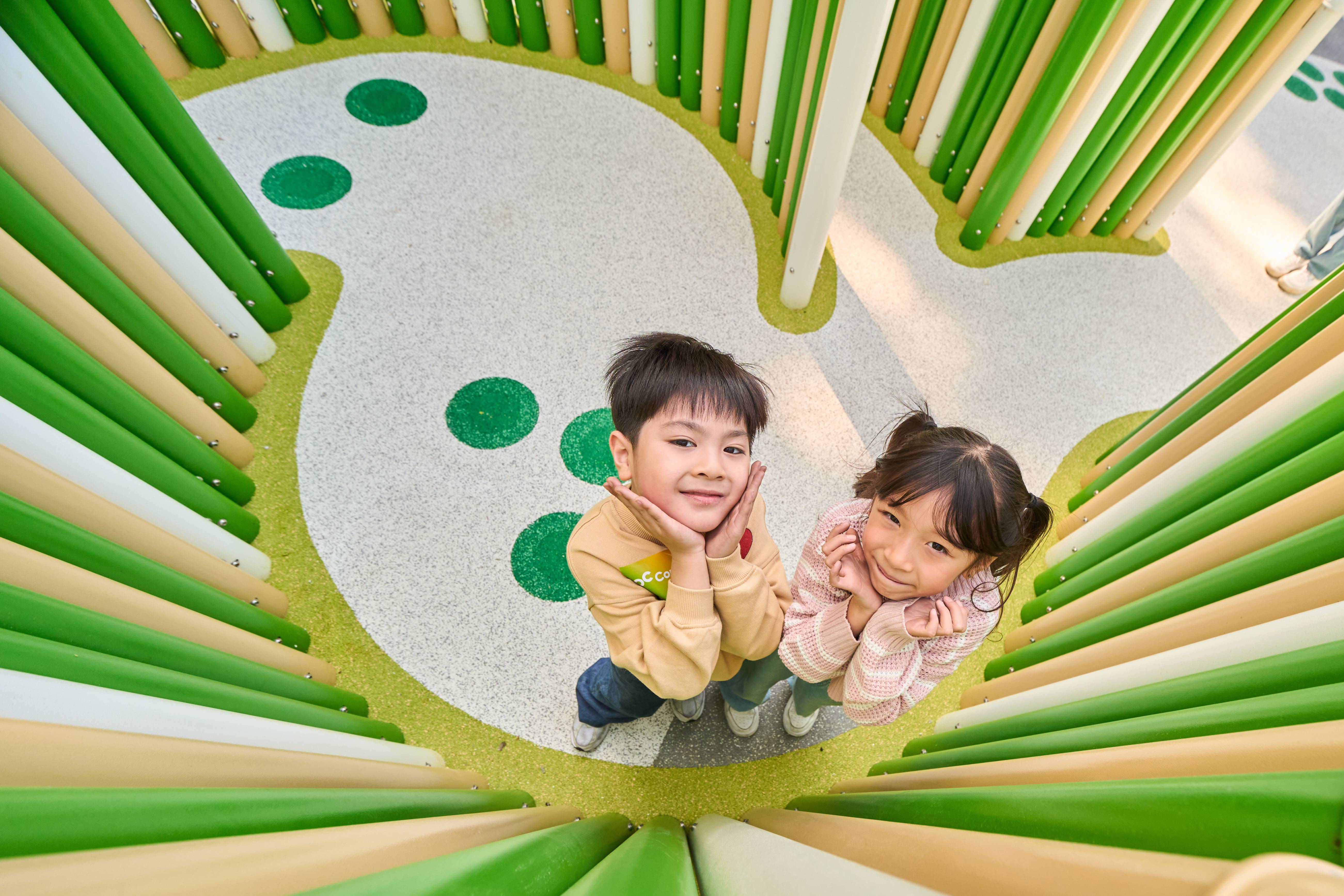 綠色遊樂環「感知區」連接動力區的興奮同時引領小朋友踏入「山丘秘境」,以設於地面的高低不平色彩繽紛小圓頂模擬自然山嶺,小朋友可以踏步跳躍同時尋找埋藏其中的聲樂感知體驗。想進一步挑戰訓練小朋友的體能與平衡力,就要來到「彈彈山丘」完成山丘彈床為大家帶來的飛躍動力考驗,之後到「竹林陣」變身攀爬高手,於不同高度與角度組成的竹竿中穿梭,大顯身手同時激活身體協調能力與感知體驗。感知區除了啟發大家的社交遊戲之外提供自由遊戲機會,讓社區在這裏發掘自己的遊樂可能!