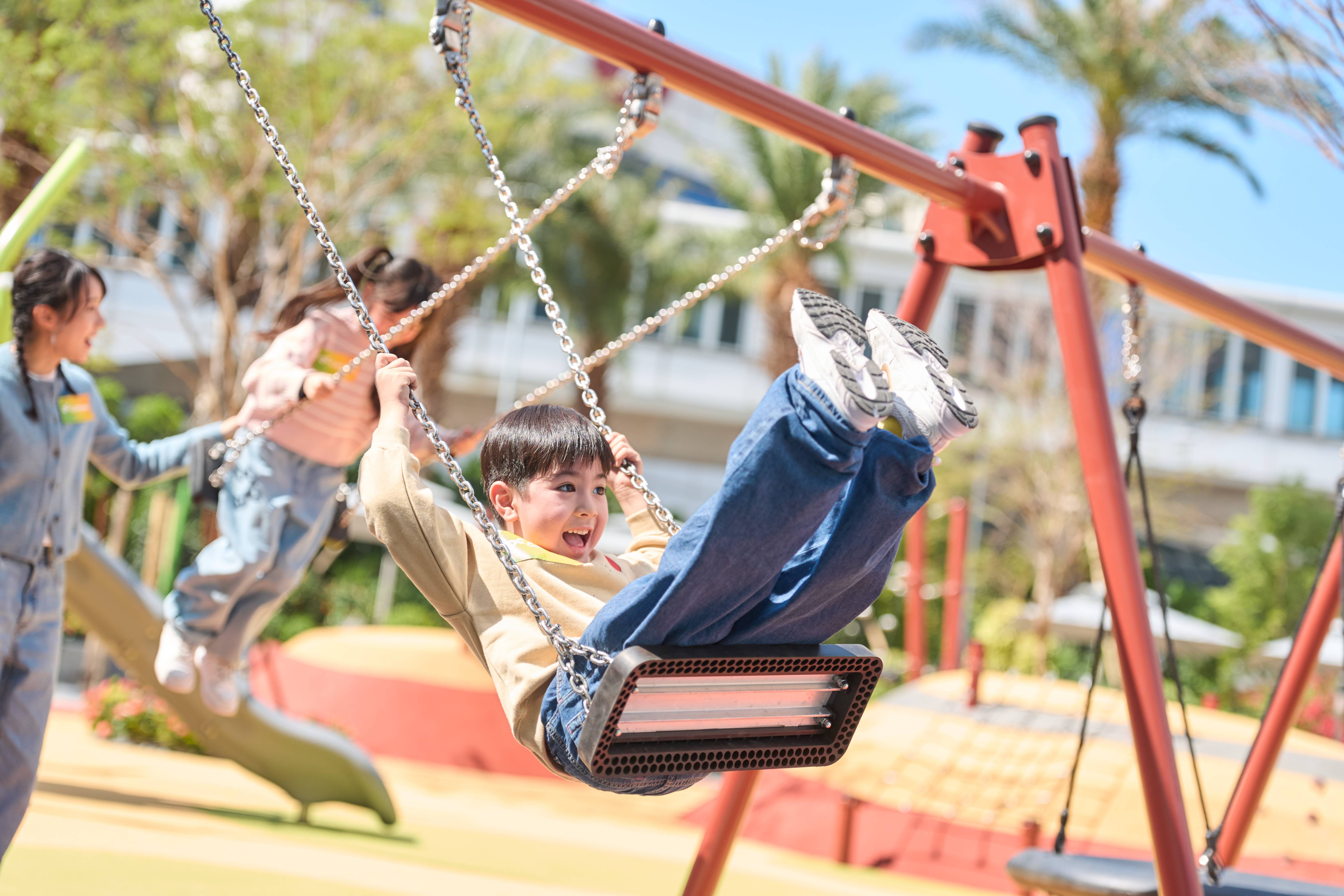 紅色遊樂環「動感區」承接之前兩大遊戲區域的熱身與激活感知體驗,「動感區」以遊樂場內最多的7項設施,為小朋友「放電」,盡情釋放自己的好玩基因。以自然森林環境作為靈感,區內設有分布不一的樹狀柱、攀爬繩索、鞦韆與滑梯,讓小朋友發揮創意,於其中找到屬於自己的冒險路線,與朋友互相協助扶持闖蕩,增強社交能力。當中特設「共融氹氹轉」,與地面高度一致的地台設計及特設輪椅空間,讓傷健朋友可以一同享受遊樂場設施。小朋友與玩伴們於「動感區」可以一同發展出獨家玩法,鍛煉身體、刺激創意思維、加強人際溝通!