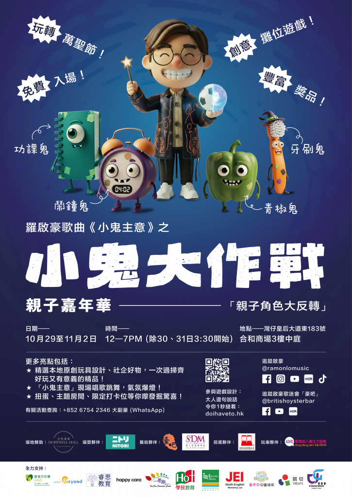 小鬼大作戰|隨著秋意漸濃,萬聖節的歡樂氛圍也悄然蔓延。今年十月,一場別開生面的親子嘉年華《小鬼大作作戰》將在灣仔合和中心中庭熱鬧登場。這場由《中年好聲音》「超班靚聲王」羅啟豪及其歌迷會「豪吧」主辦的活動,不僅打破傳統萬聖節活動的框架,更以創意遊戲與互動體驗,重新定義親子溝通的意義。