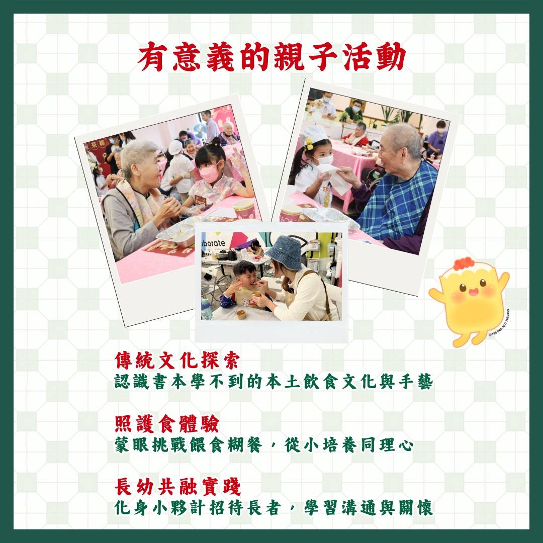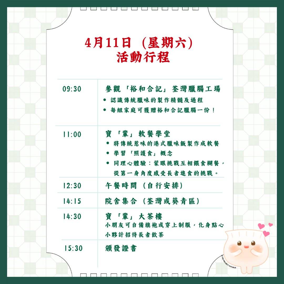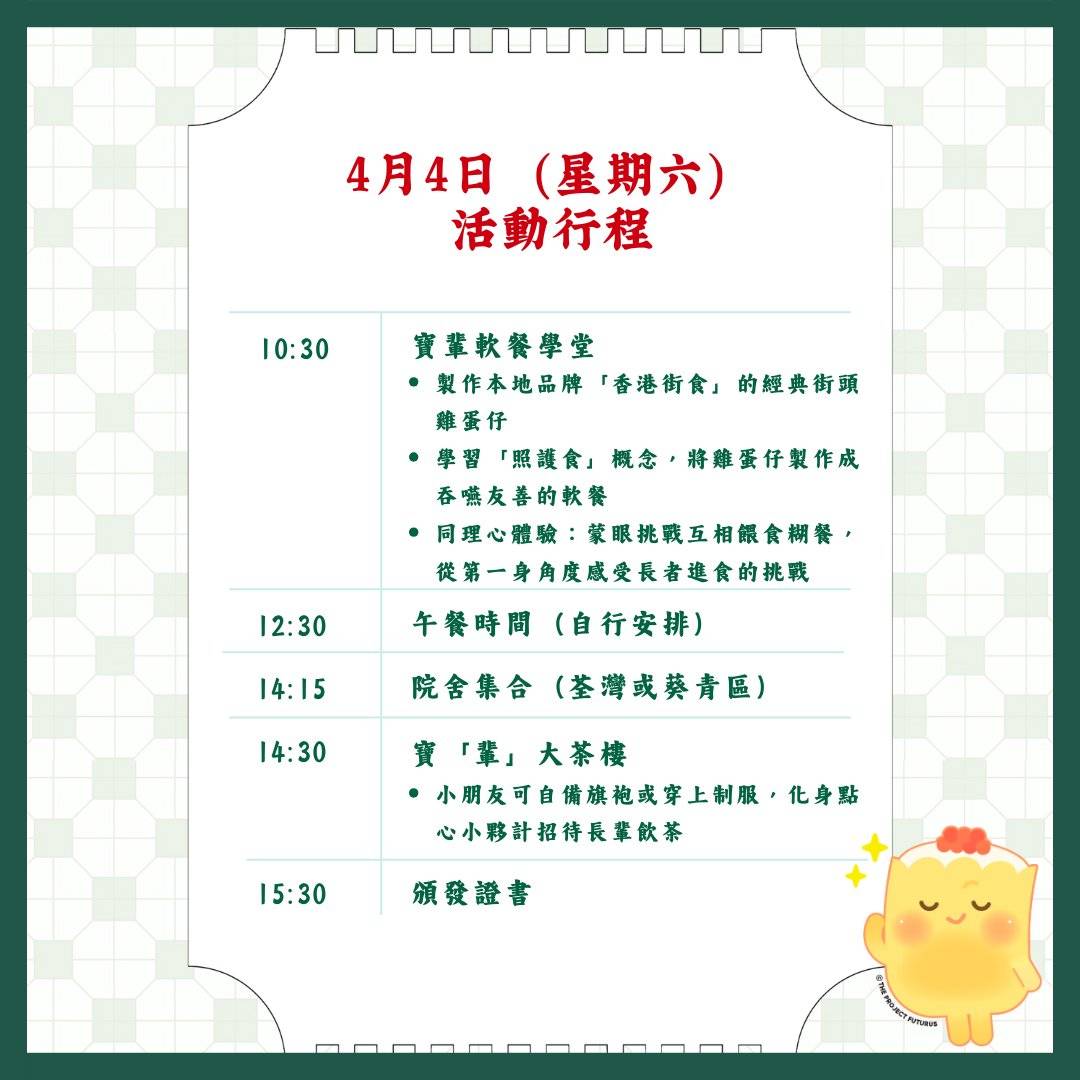 4月4日:香港經典街頭小食 – 雞蛋仔 時間為上午10:30至下午3:30,收費為一位大人加一位小朋友$750,一至兩位大人加兩位小朋友$1300。上午在The Project Futurus工作室進行「寶輩軟餐學堂」,小朋友可在懷舊車仔檔打卡位拍照,親手製作「香港街食」雞蛋仔及雞蛋仔軟餐,並透過蒙眼挑戰互相餵食糊餐,體驗長者日常。下午則到院舍化身點心小夥計,招待老友記飲茶食點心。