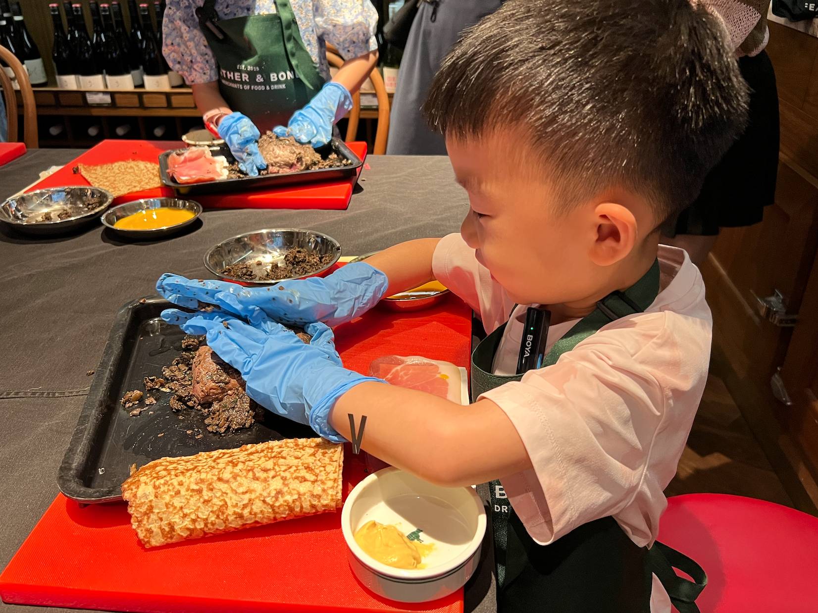 在專業廚師的指導下,小朋友首先學習分辨不同肉類的部位,了解每個部分的特性和最適合的烹調方法。從牛肉的不同切割部位,孩子們認真聆聽講解,學會辨識肉質紋理,明白為什麼不同部位需要用不同的烹調技巧。這個過程不僅增加了他們對食材的認識,更培養了細心觀察的能力。