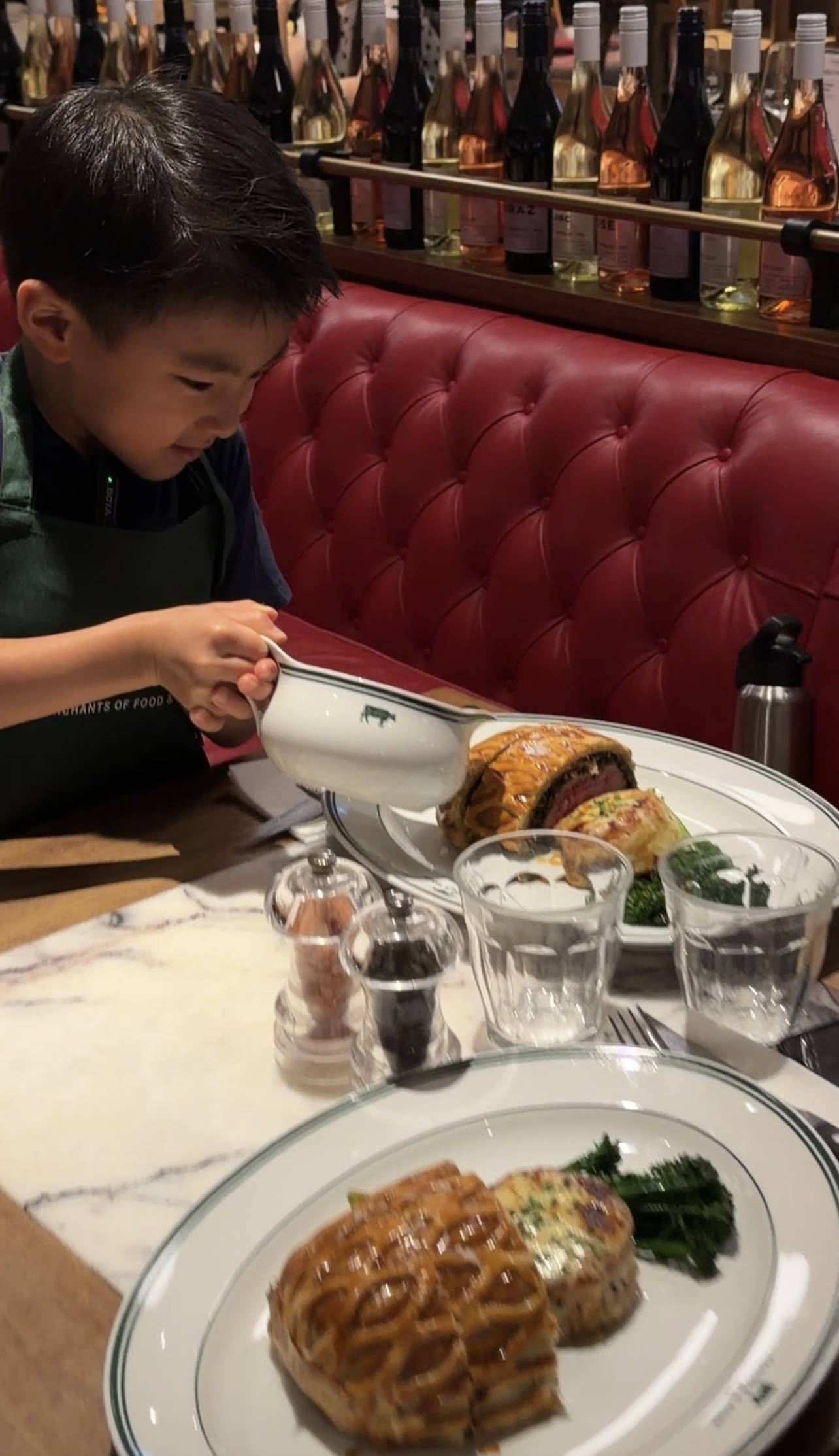 最後一個任務是將親手製作的威靈頓牛柳端上餐桌。小朋友們學習正確的上菜姿勢和服務禮儀,體驗餐廳服務員的工作。看著自己親手製作的料理被端上桌,孩子們臉上都洋溢著自豪的笑容。這個環節不僅讓他們學會服務他人,更培養了責任感和成就感。