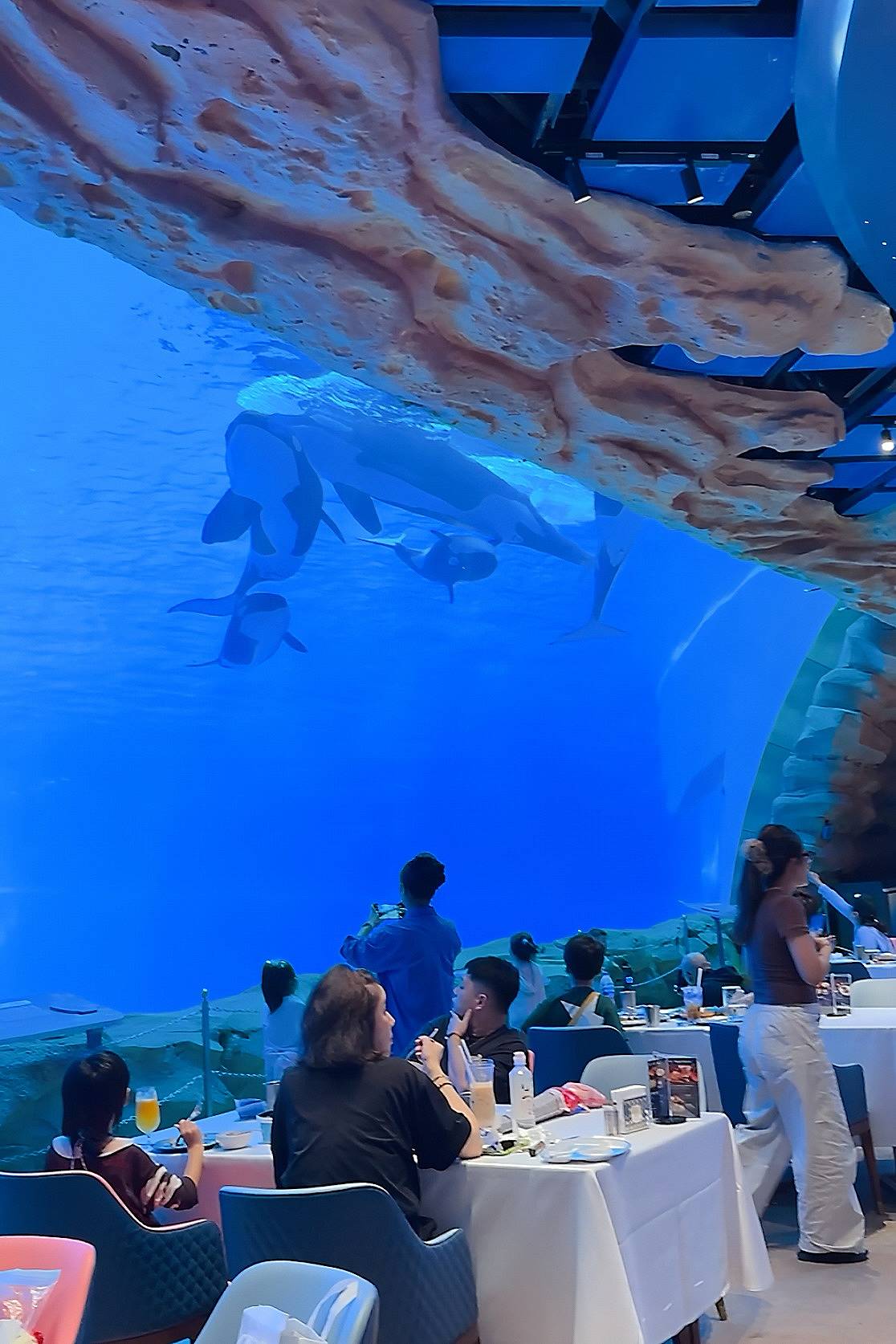 一邊欣賞虎鯨優雅泳姿,一邊享用多元餐飲。餐廳設計融入海洋保育訊息,讓親子在用餐過程中討論動物保護議題,深化學習成果。