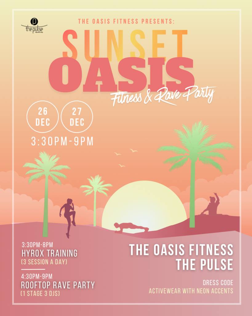 作為聖誕壓軸(12月26至27日),於商場的180度海景空中花園舉行。由Oasis Fitness聯手打造,融合Hyrox訓練、狂歡銳舞派對與桌上遊戲,在海風與音樂中為新年充電。活動所有收益將全數捐贈給受大埔火災影響的居民,讓歡樂更具意義。
