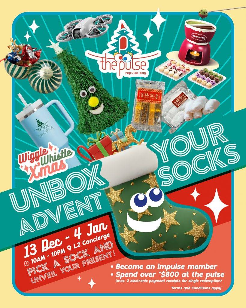 聖誕消費獎賞更是誠意滿滿。在2025年12月13日至2026年1月4日期間,於商場消費滿港幣800元,即可到L2禮賓部親手挑選一隻「Advent Sock」禮物襪,100%保證中獎。獎品包括the pulse獨家限量的「WishWiggle Tree & Friends」系列精品(如保溫杯、公仔)、商場禮券、Venchi朱古力,乃至DJI航拍機或Häagen-Dazs雪糕火鍋套裝等驚喜大獎,讓節日歡樂延續。
