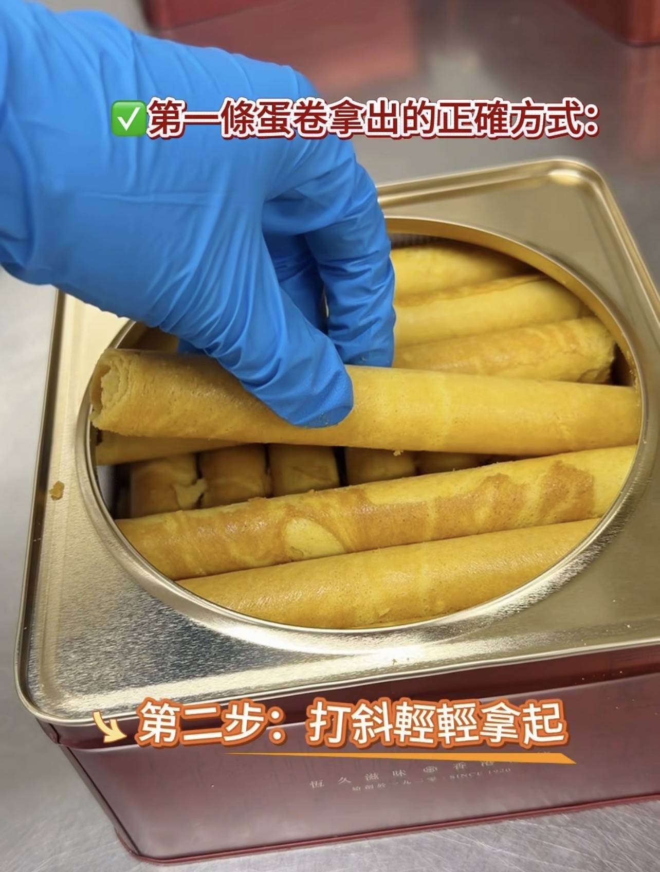 恆香老餅家回應網民熱搜,再度拍片傳授取卷技巧。原來要讓蛋卷條條完整的秘訣不在於指力,而是取決於空間與角度。只需簡單兩個步驟,即可完美取出蛋卷: