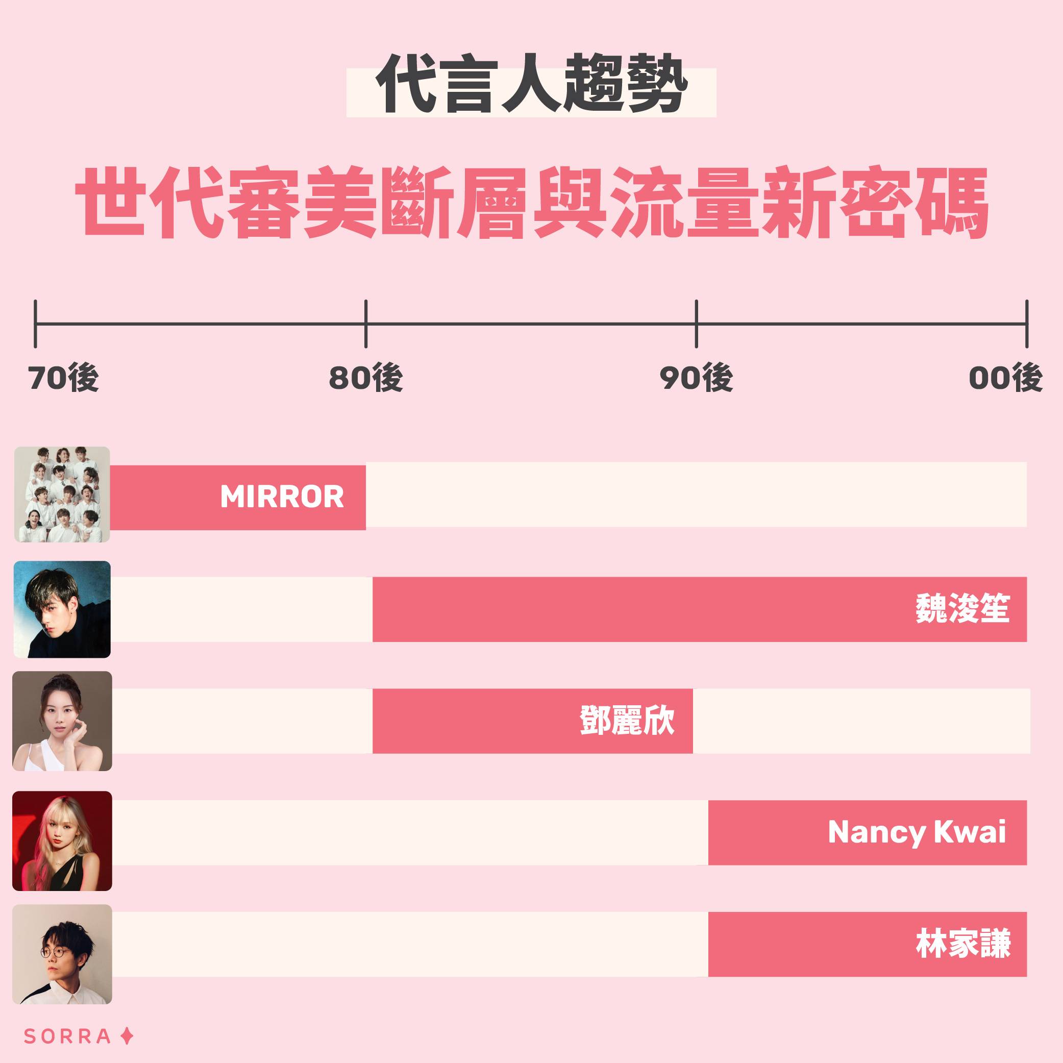 Sorra創辦人Jessie Chan表示:「我們從數據中看見:代言人已不再只是美的化身,而是一種『心理代號』。面對70、80後的『情感寄託』與00後追求的『共鳴感』,品牌如果不隨著這股趨勢,重塑對話邏輯,單純更換代言人也只是無效的投資。」