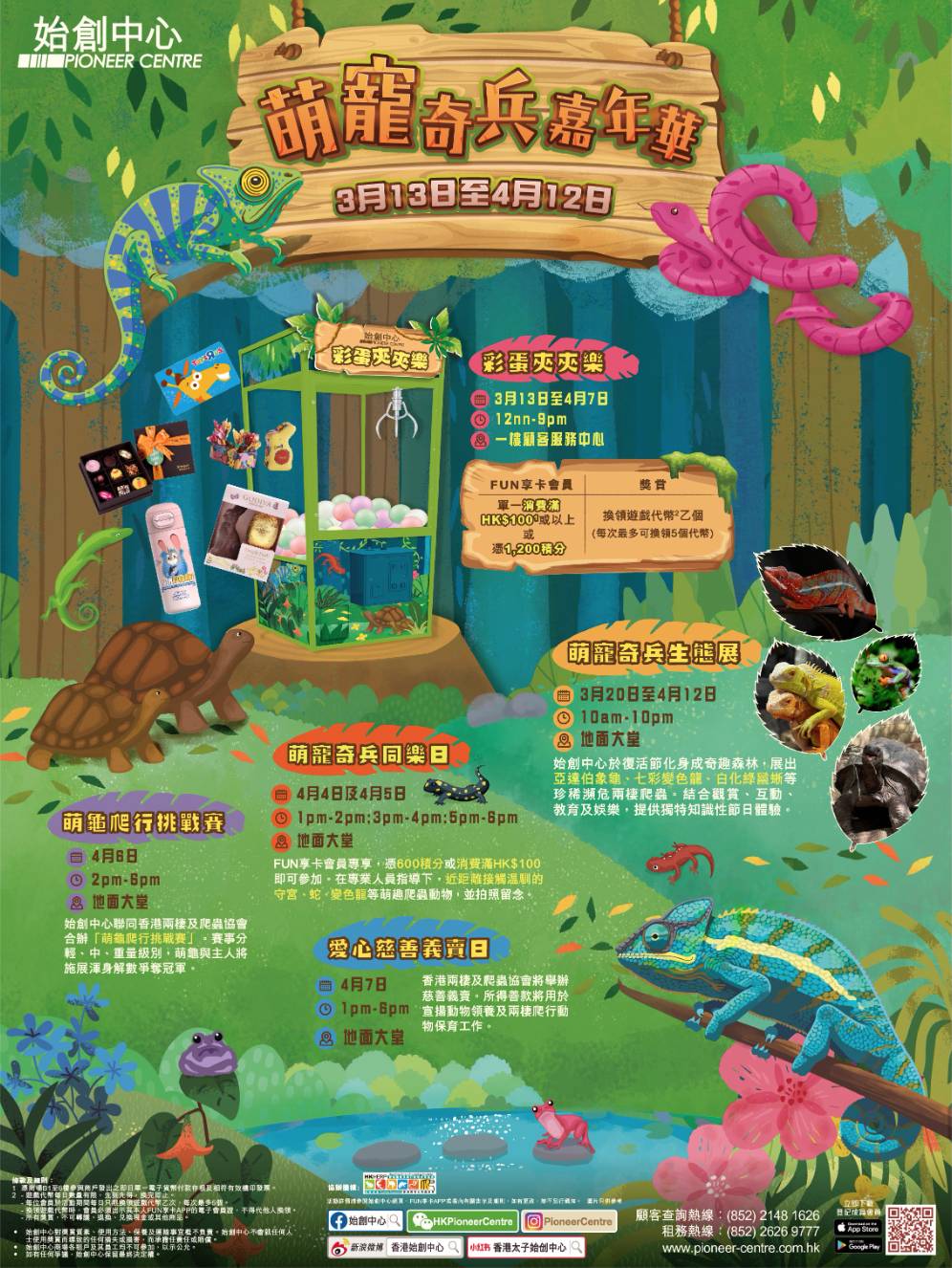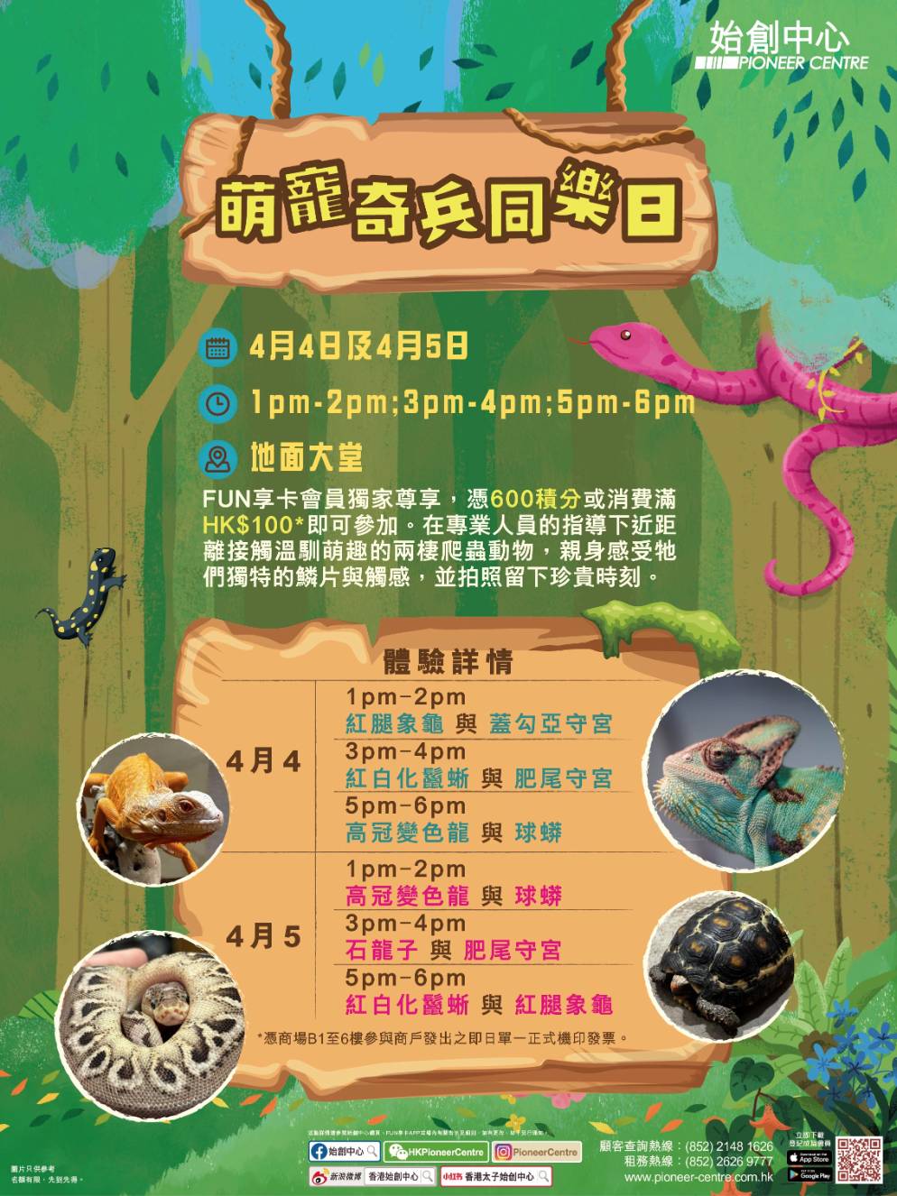 最特別的是「萌寵奇兵同樂日」,商場會員只要消費滿$100或用600積分,就可以在專業指導下零距離接觸紅腿象龜、球蟒和高冠變色龍等小動物。小朋友可以感受牠們鱗片的質感,同時培養同理心同愛護動物的觀念。