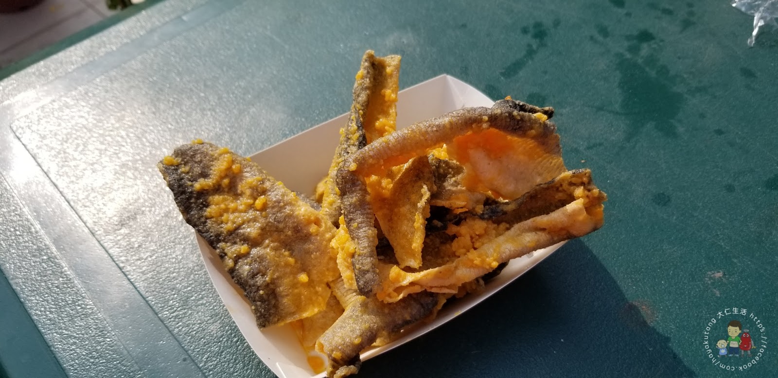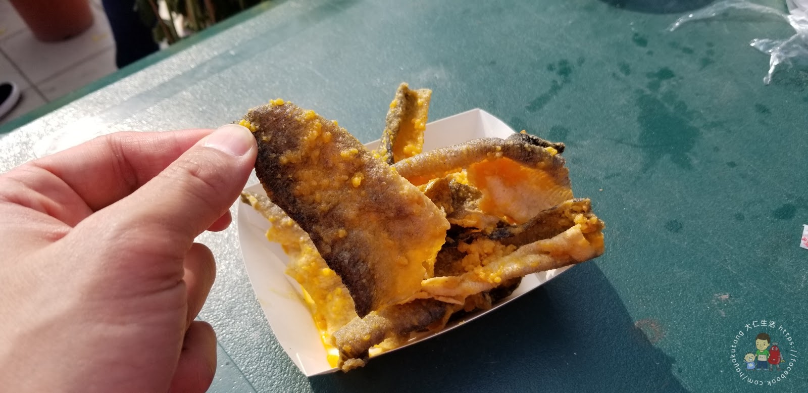 之後, 依莉帶來一盒香噴噴的黃金蛋黃炸魚皮, 依莉:「佢係即炒架, 仲熱架, 不過, 份量少過我哋上次屯門花市食嘅」