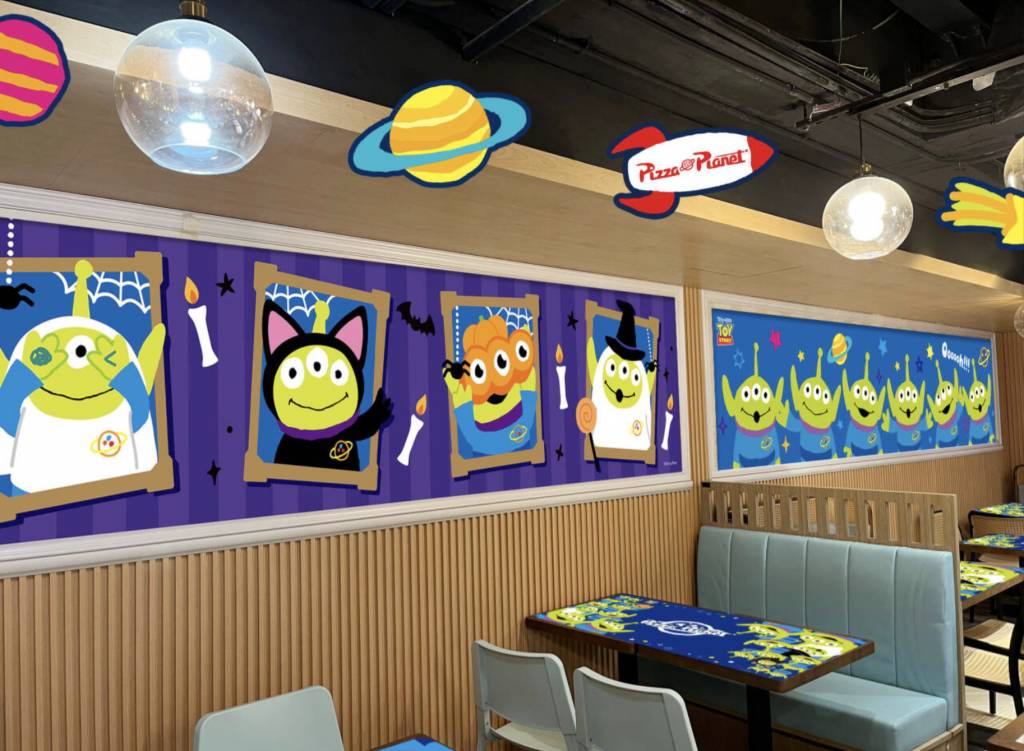 打卡體驗方面,店外設有以火箭及積木為主題的「火箭三眼仔登陸區」,店內則佈滿紫綠配色萬聖節裝飾,包括角色掛布、巨型角色足印地板,以及「星際整隊牆」與萬聖節變裝畫框等裝置,處處都是拍照勝地。