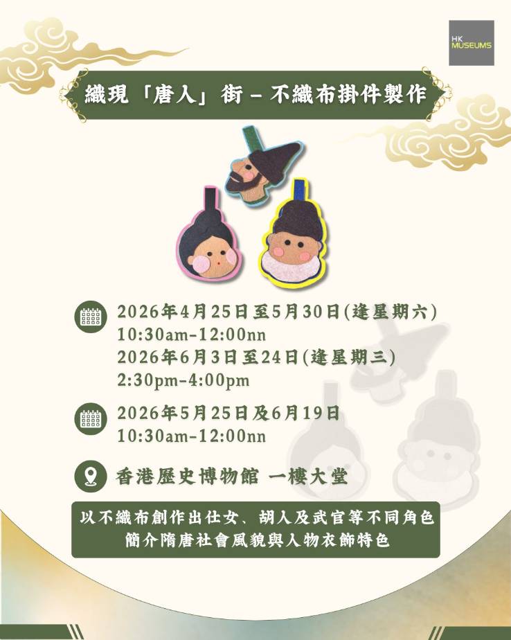 體驗唐代織品紋樣與服飾特色,製作可愛實用掛件,可裝飾書包或房間。