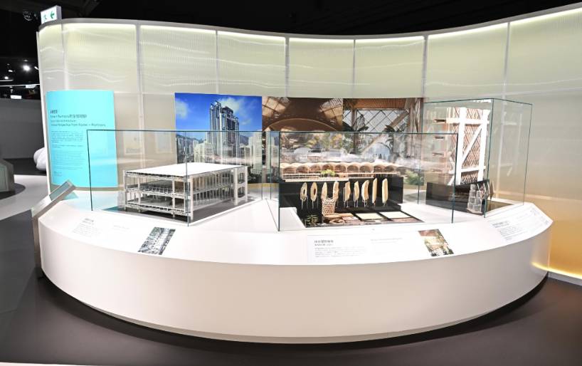 環保創新:香港科技大學研發的零排放製冷技術、以芒果皮、稻穀等製成的環保建築物料。