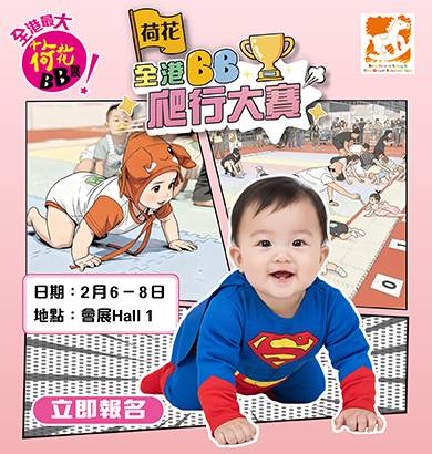 今年爬行比賽以超級英雄派對為主題,家長可為參賽BB穿上小小英雄裝扮參加。比賽於2月6至8日舉行,每節小組最快完成賽事將獲冠亞季軍,所有參加BB均可獲證書及豐富禮品。完成比賽的BB更可到「爬行拍照區」體驗免費專業拍照,並獲得4R照片一張。比賽只設預先報名。