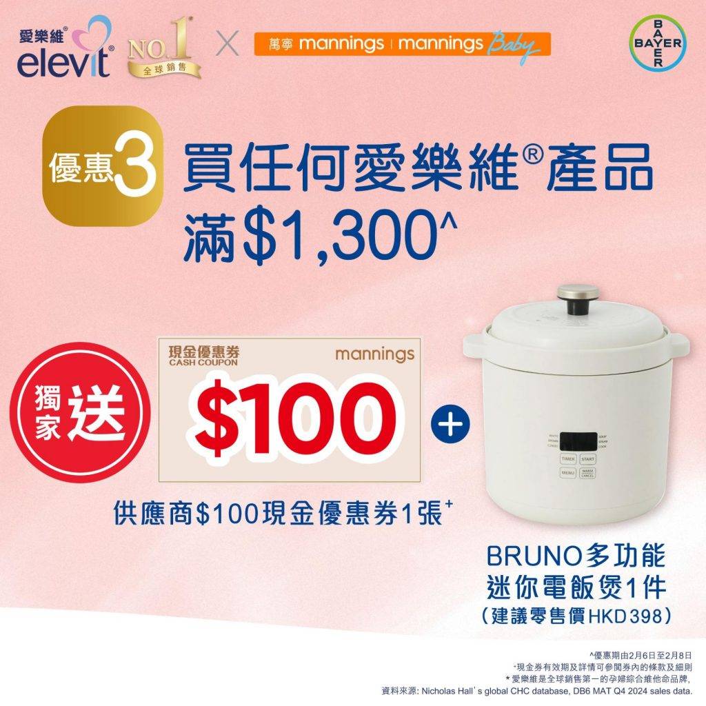 買滿$1,300^ 獨家供應商$100現金優惠券⁺1張 及 BRUNO迷你電飯煲1件(建議零售價$398)