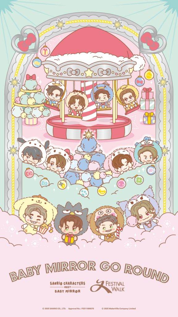 此外,2.6米高的聖誕水晶球內雪花紛飛,吸引HELLO KITTY與BABY KEUNG TO等角色駐足;而同為2.6米高的綿花糖車則由HANGYODON與BABY JER化身店長,為觀眾奉上甜蜜驚喜。場內還設有8米長的夢幻互動隧道,鏡面與燈光交織出閃耀的「M」字標記,並輪流播放MIRROR成員與Sanrio角色的互動片段,每一步都充滿驚喜。