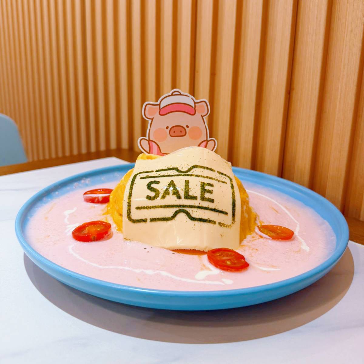 • 明太子芝士蛋包飯(HK$129):粉紅色明太子醬配合SALE字眼,可愛滿分