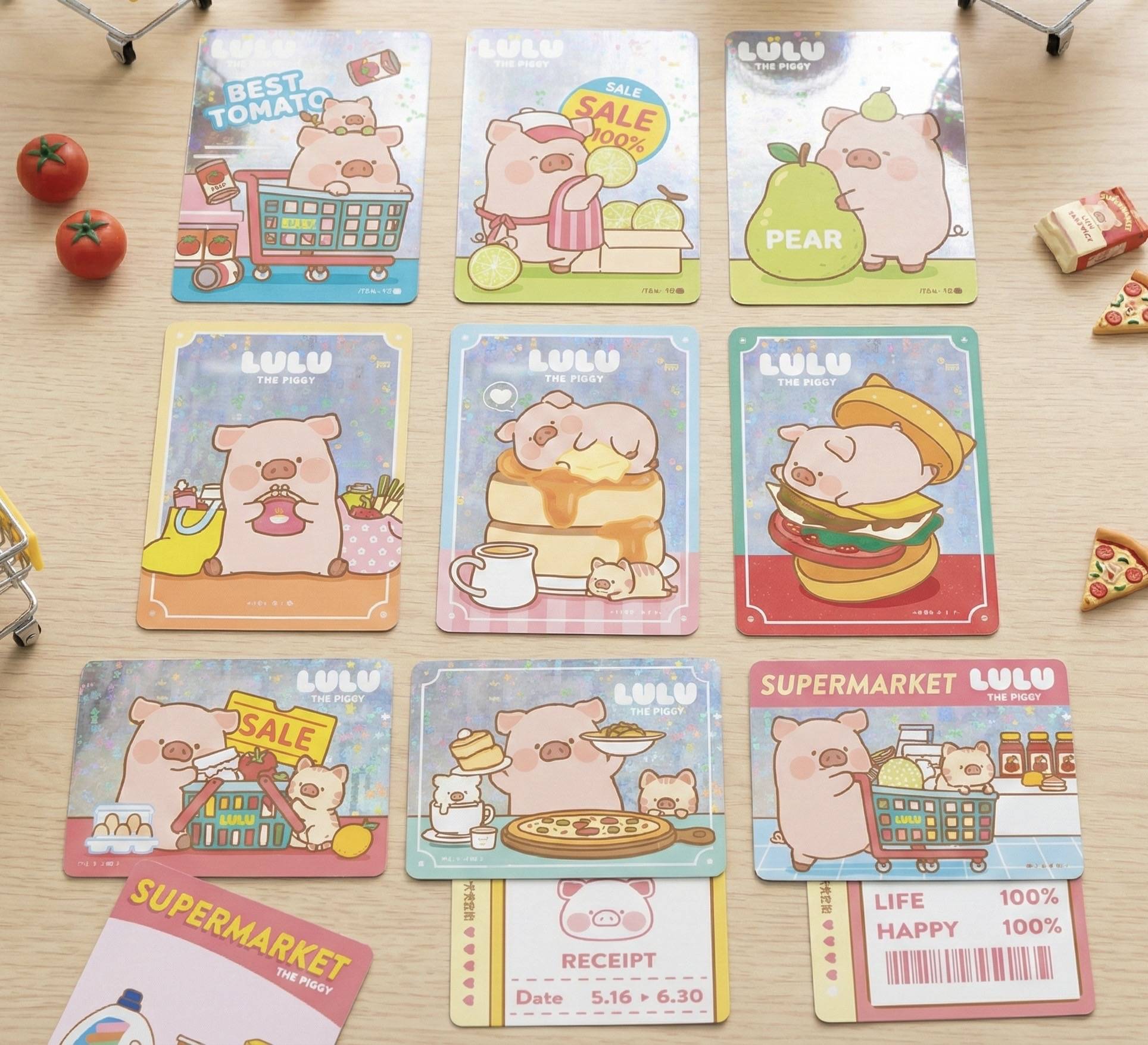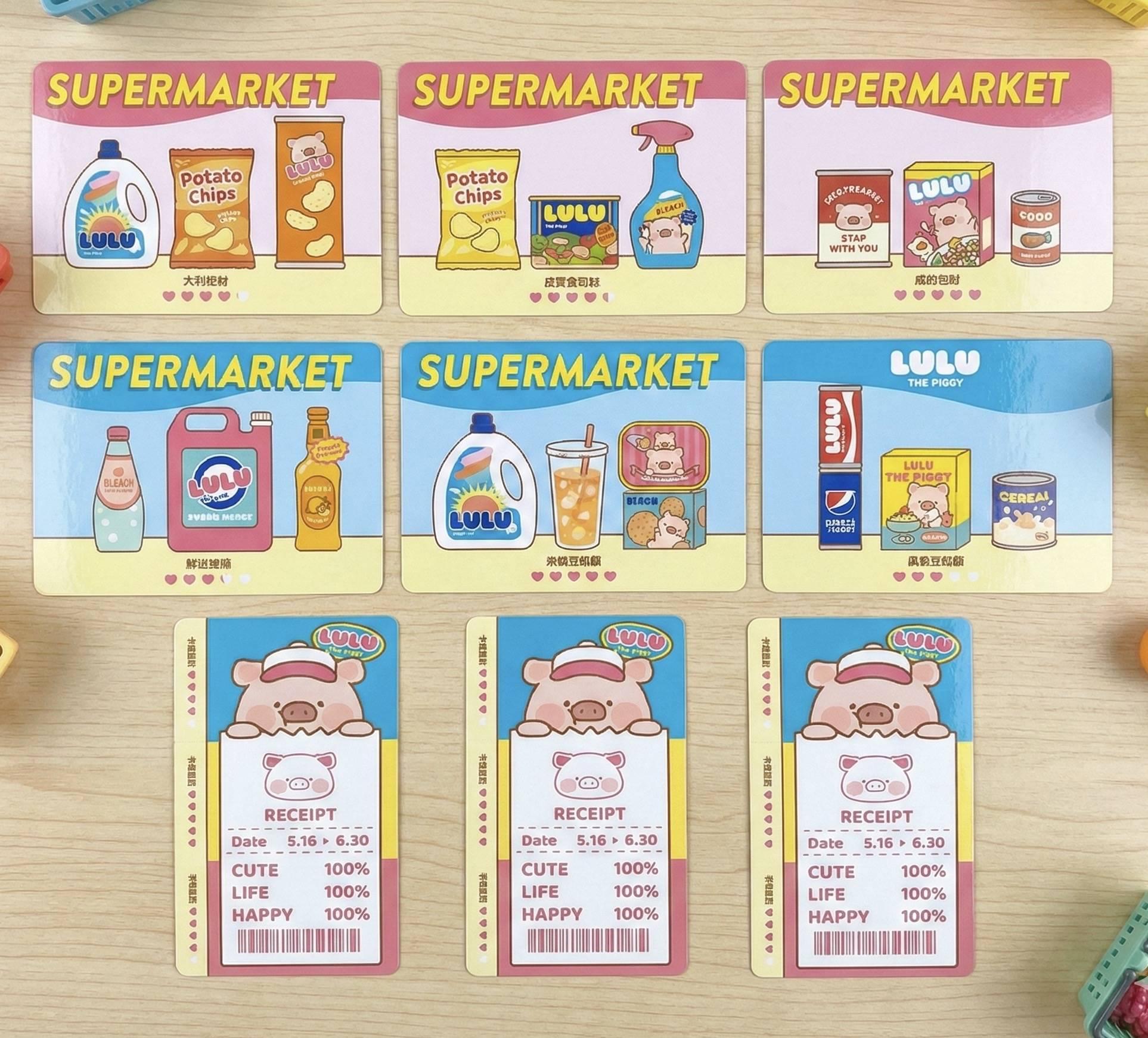 門口設有多個必拍打卡位,包括1:1大型3D LuLu豬公仔、超市收銀員角色扮演區,以及標註著CUTE、LIFE、HAPPY均為100%的巨型收據。室內牆面貼滿LuLu豬在水果區挑選蘋果、在烘焙區研發麵包的可愛插畫,座位上更有紅、黃、藍三色的LuLu豬罐頭造型抱枕,讓孩子們可以盡情拍照留念。