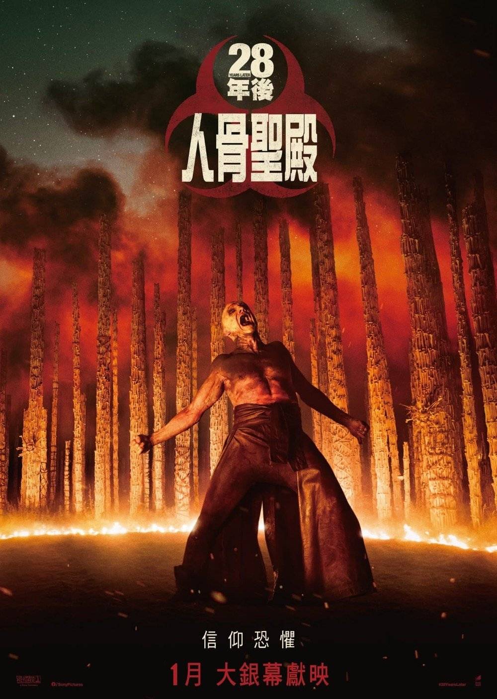 28年後:人骨聖殿預告講述Sony Pictures 榮譽發行災難喪屍鉅製《28年後》三部曲,第二章《28年後:人骨聖殿》將於2026年1月獻映!《糖魔怪客》新銳導演妮雅達柯斯塔(Nia DaCosta)執導、神級編劇阿歷士嘉倫(Alex Garland)操刀劇本,金像級導演丹尼波爾(Danny Boyle)同《奧本海默》影帝斯里安梅菲(Cillian Murphy)坐陣監製。《教宗選戰》《舒特拉的名單》影帝級賴夫費恩斯(Ralph Fiennes) 與 《罪人們》硬漢代表積奧干奴(Jack O’Connell)攜手率領潛力新星艾菲威廉斯(Alfie Williams)主演!