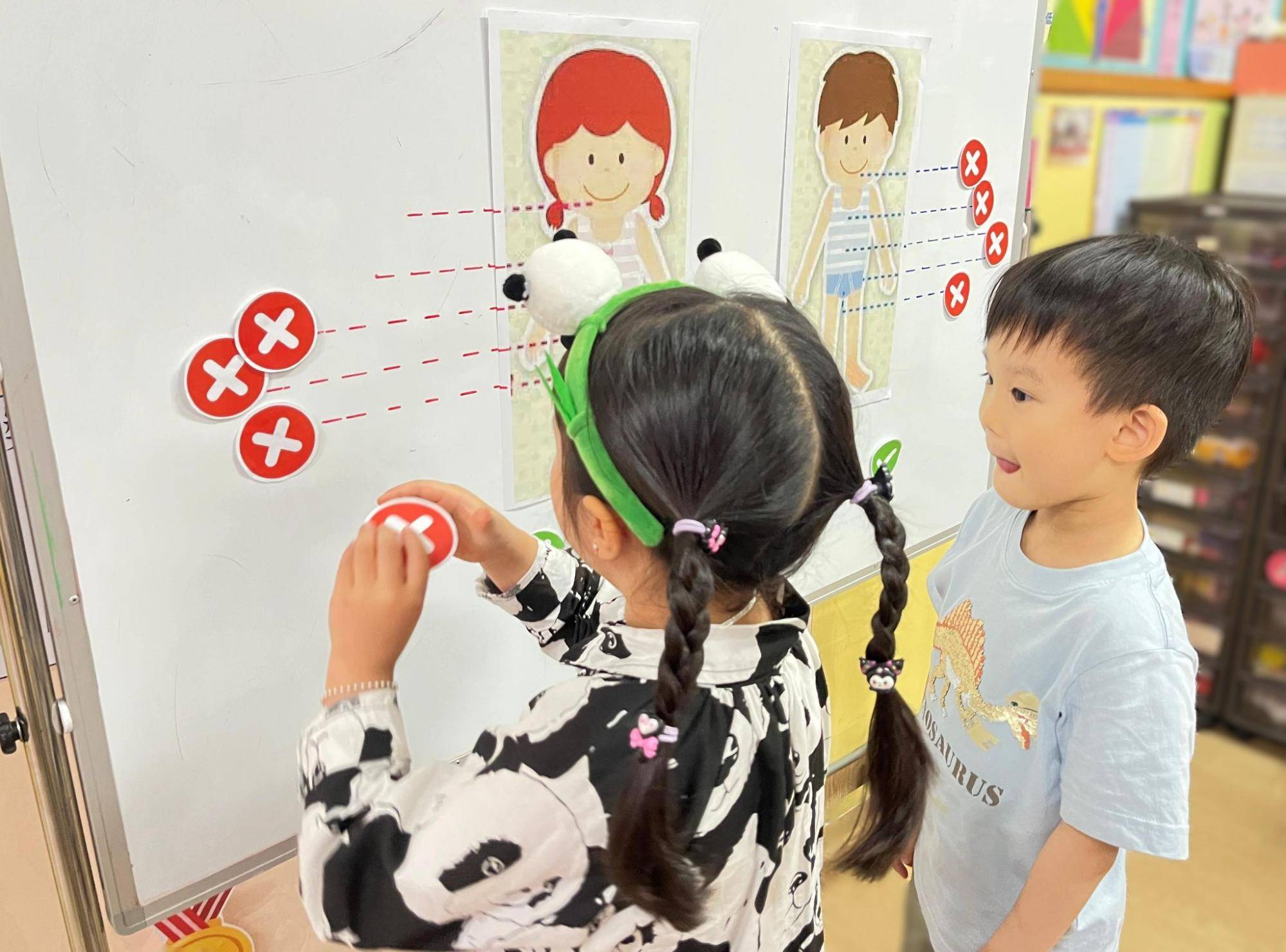 課程教學方面,學校特別設計以「身體安全」為核心的自我保護課程,透過繪本共讀的教學、情境模擬等互動方式,讓孩子在遊戲中學習自我保護,建立正確的身體界線意識。