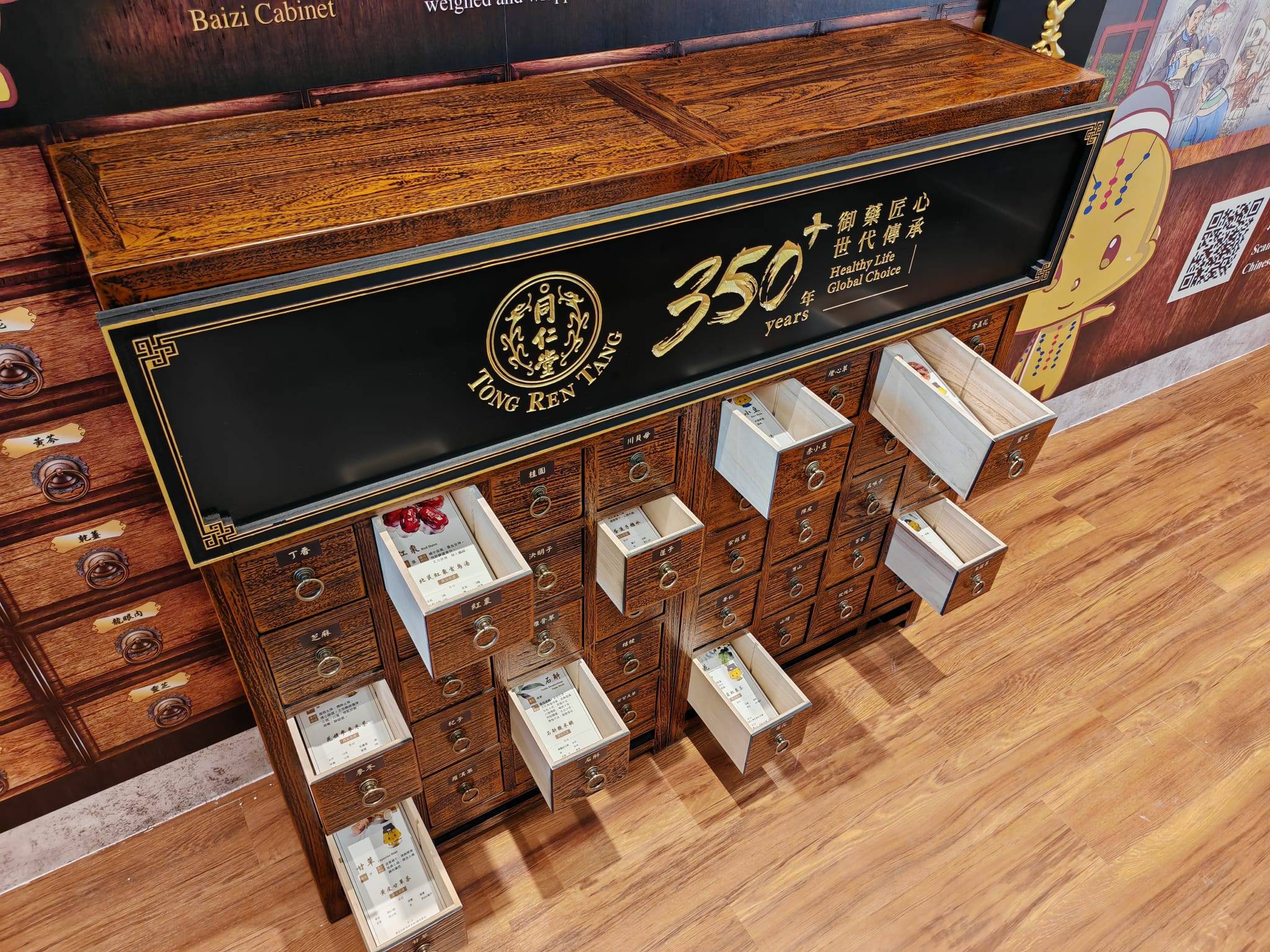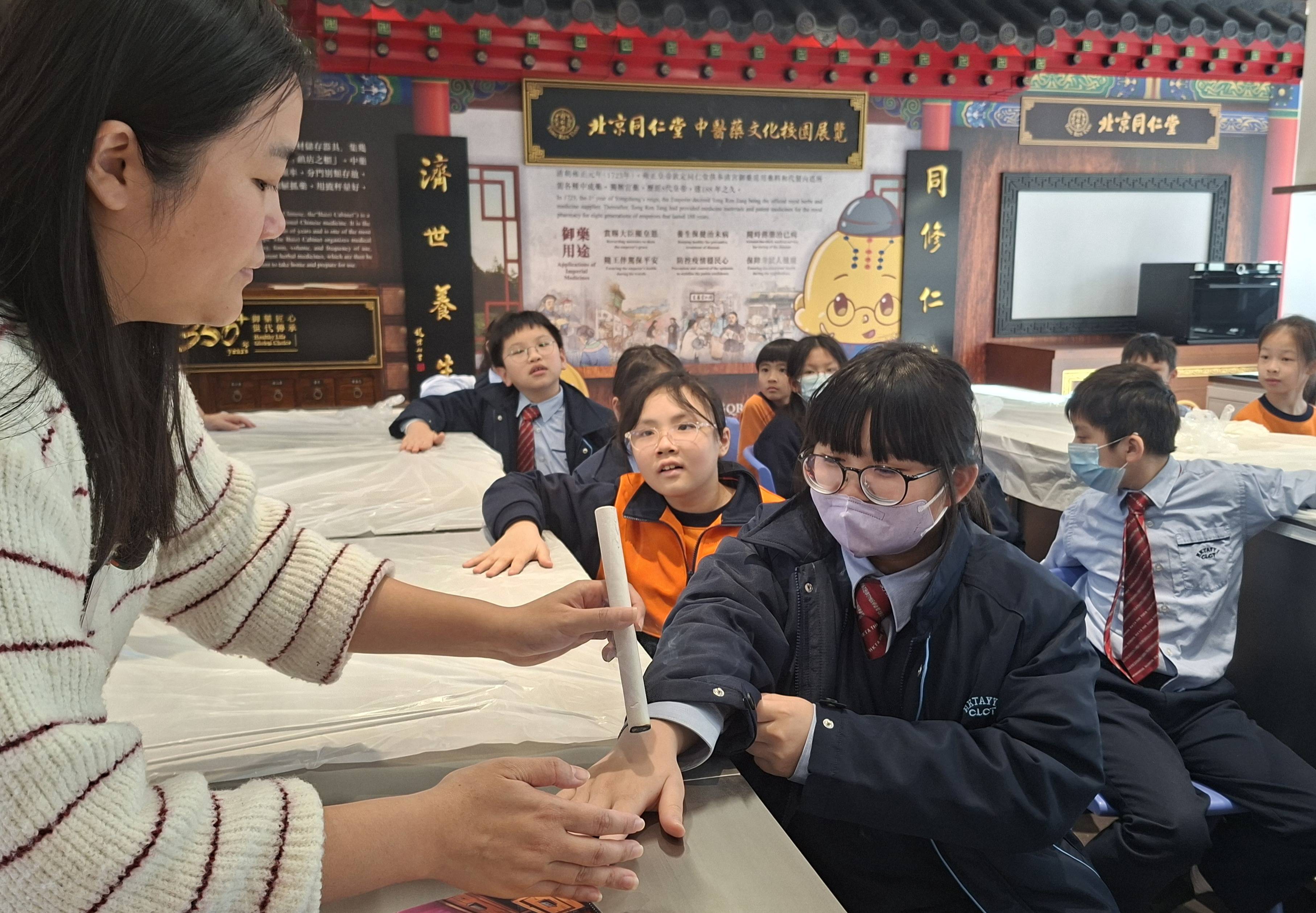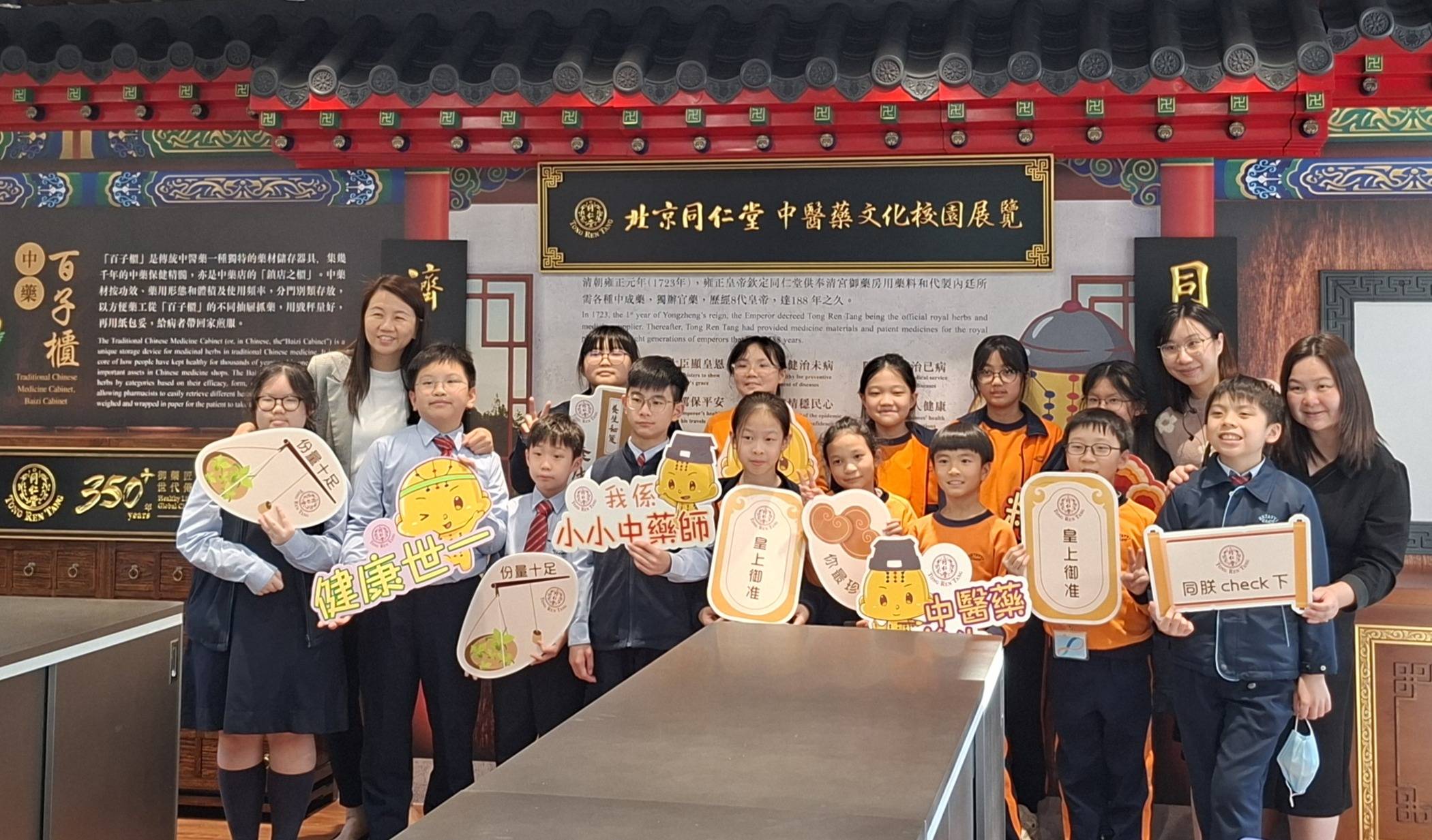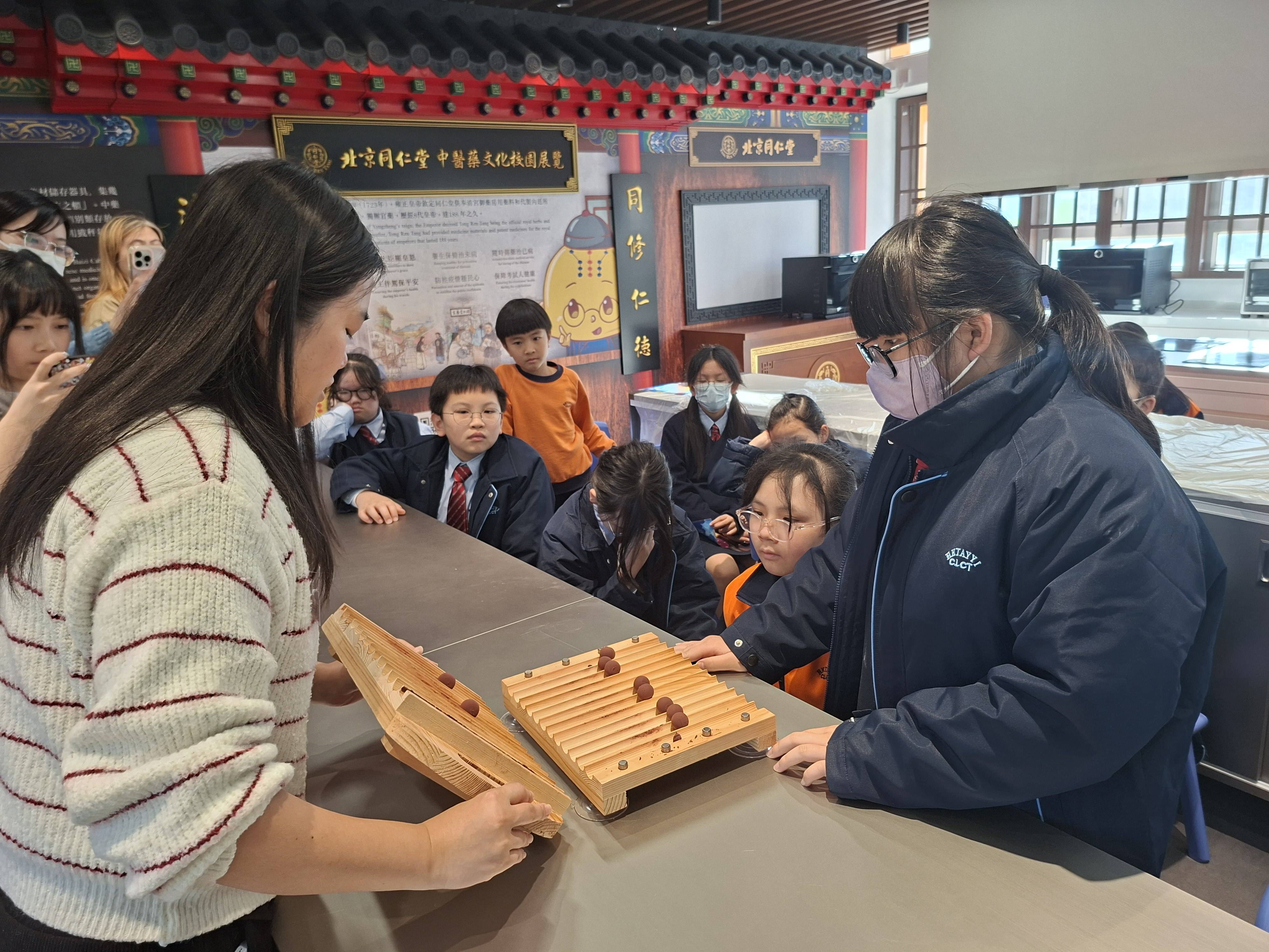 為深化學習體驗,校園的活動室和操場增設「北京同仁堂中醫藥文化校園展覽」,介紹藥食同源的中草藥,以及古代宮廷御藥的文化歷史和用途。課室內設置傳統中藥百子櫃,對學童來說充滿神秘感,吸引他們拉開木抽屜,逐格認識各款「既是食物又是藥物」的草本材料和特性。