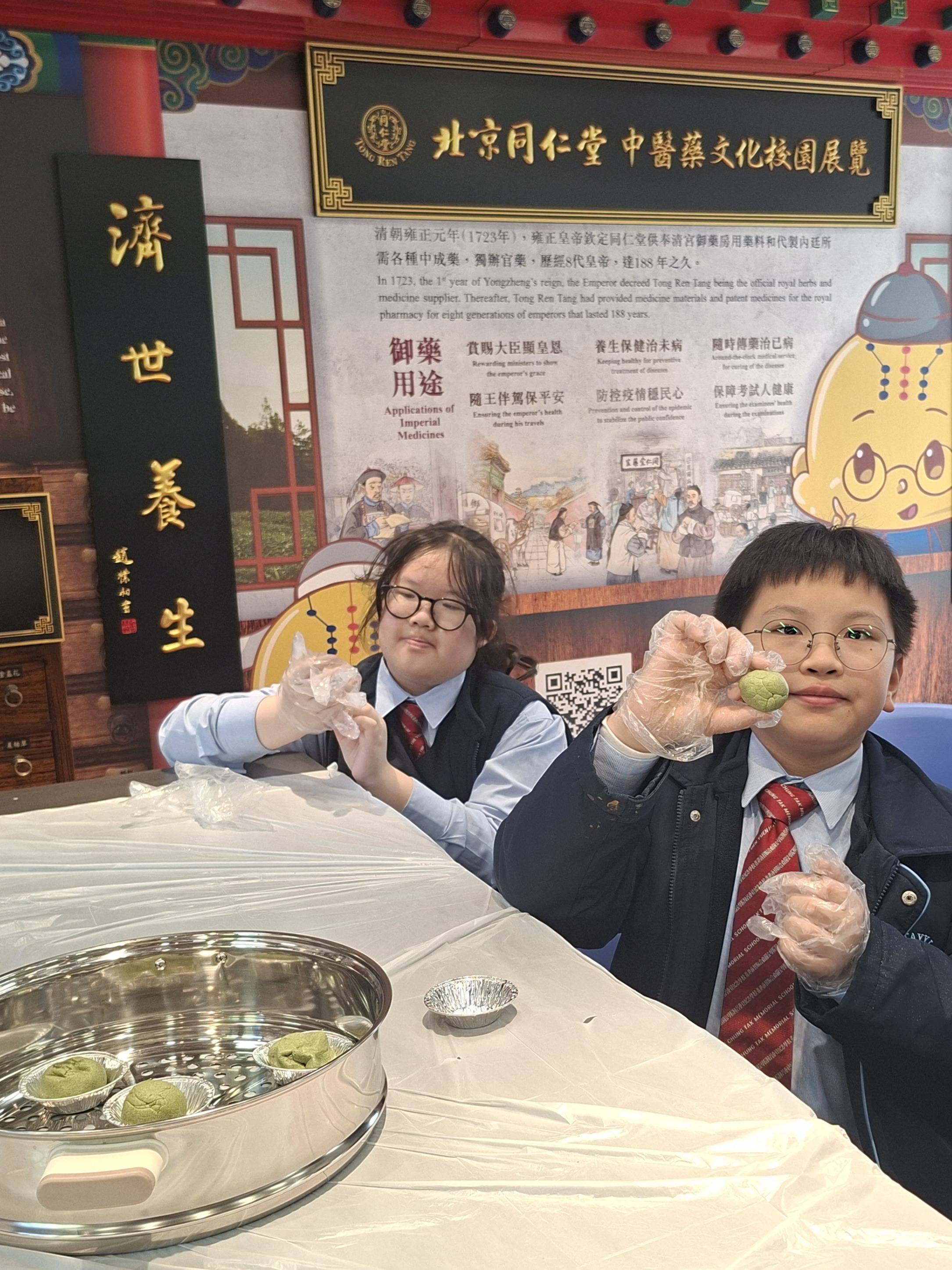 北京同仁堂更特別編寫及製作《中醫藥世界 – 「銅人」非凡之旅》漫畫冊,以造型可愛的「銅人仔」為漫畫主角,從兒童視角帶領學生認識經絡和草本健康生活。邊吃邊學及DIY體驗的學習模式更深受學生歡迎,導師帶領學生到校園農圃,親眼辨識艾草,讓同學了解到原來常用的中草藥早已於校園陪他們一同成長。學生更於堂上DIY親手製作和體驗艾草糯米糍的味道,化身小醫師炮製藥膳,連串體驗大大加深同學們對艾草的了解和日常的應用。